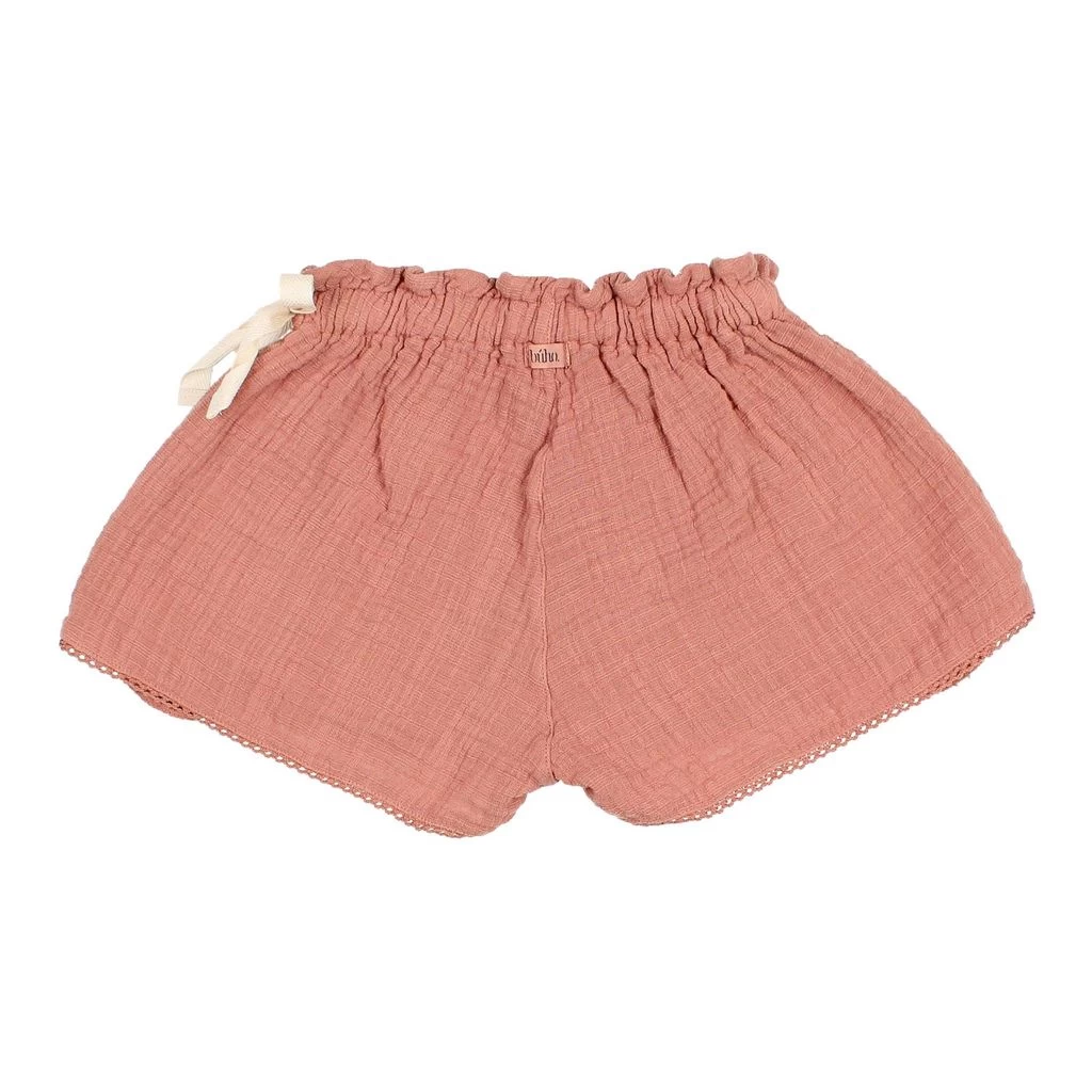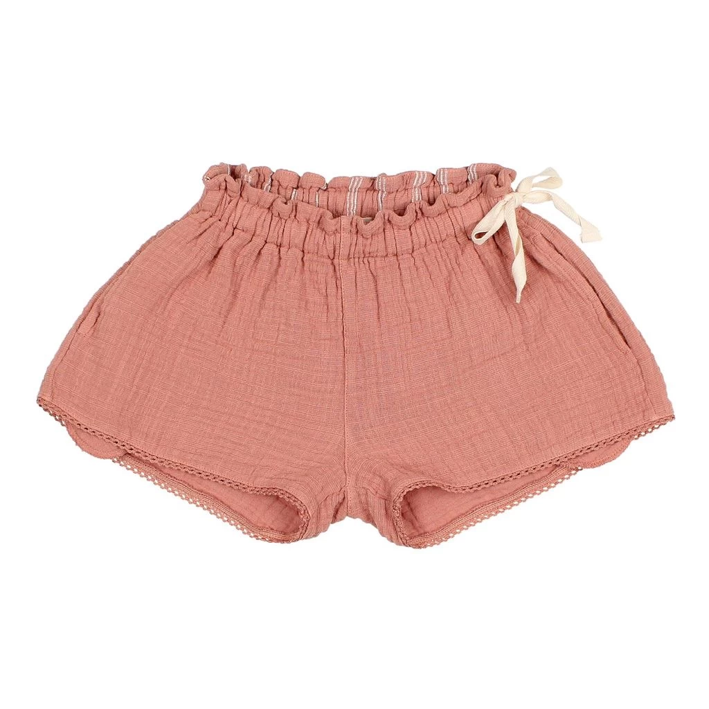 The perfect shorts for a sunny day with friends. Red Girly Muslin shorts by búho. The shorts have an elasticated waist with a knot detail. They have a lace detail at the bottom and side pockets.