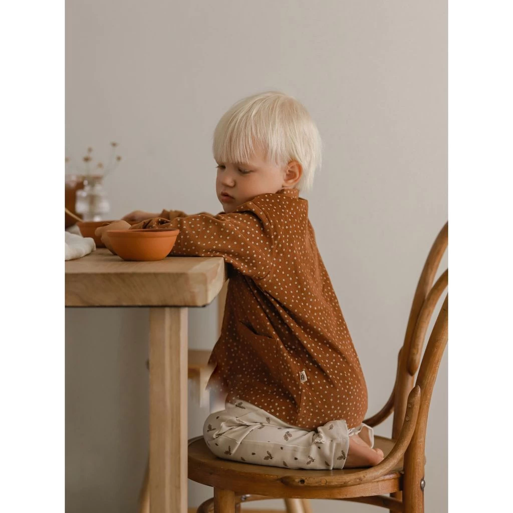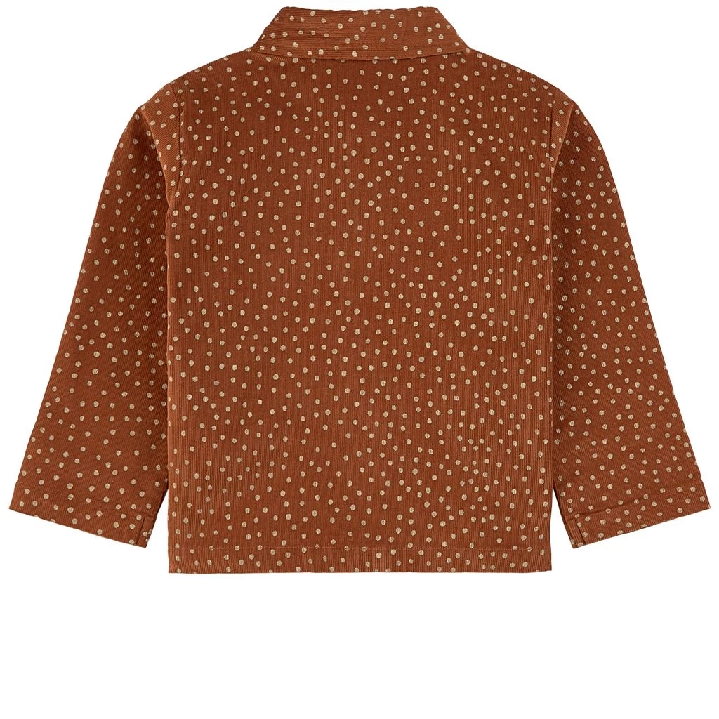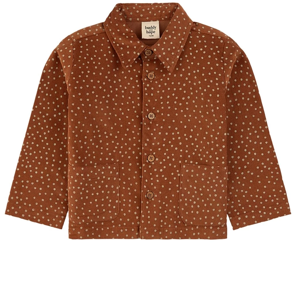 Fashionable and fun. Brown overshirt by Buddy & Hope in corduroy. The shirt has a dotted design. It has a point collar, a button closure at the front and two front pockets.