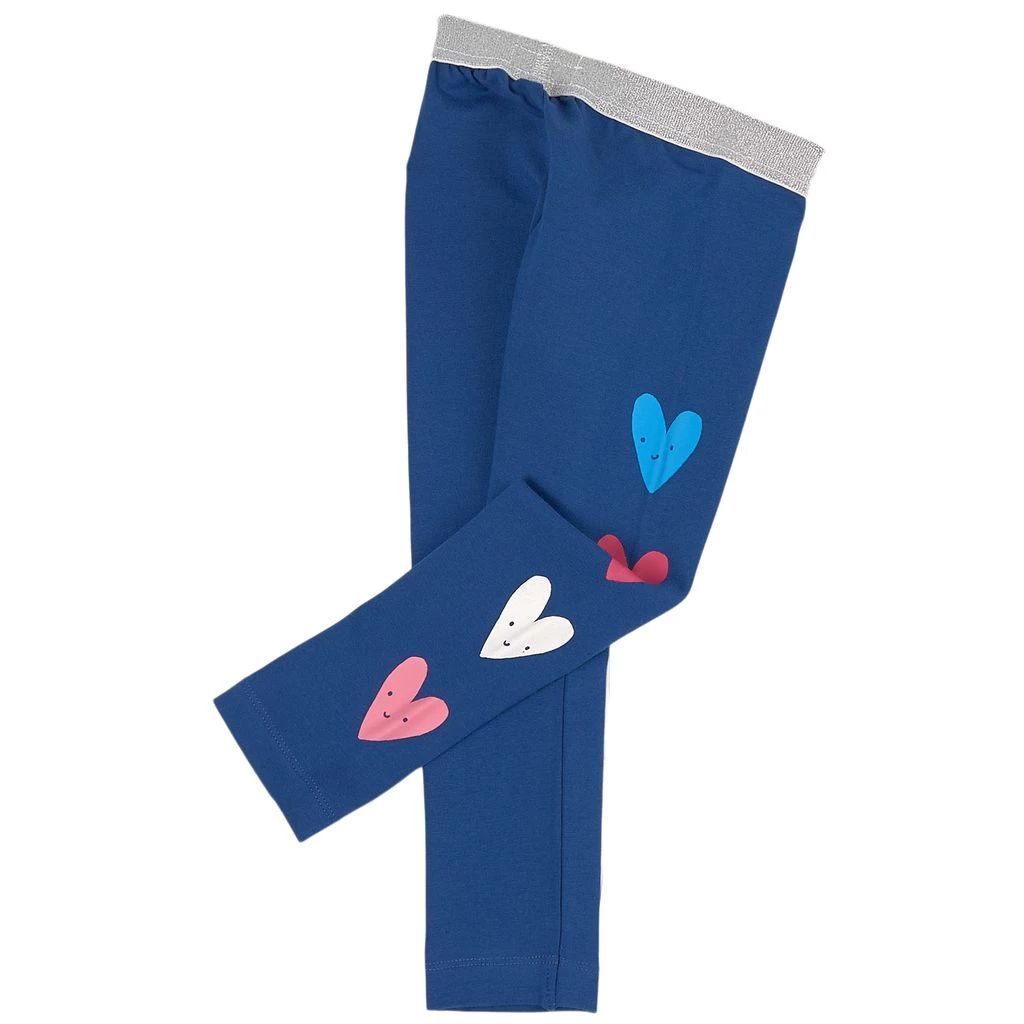 Stay in style with these trendy leggings. Blue leggings by Hatley. The leggings have a silver glittery elasticated waist. They have heart prints at the sides.