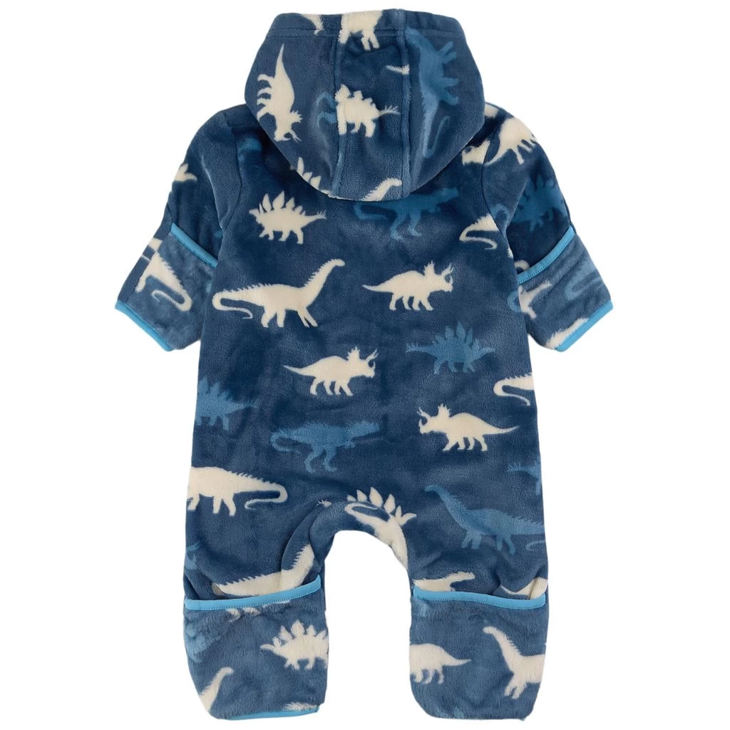 Keep warm with comfy fleece. Blue fleece onesie by Hatley. The fleece onesie has a fixed hood. It has a zip closure at the front and fold-over cuffs.