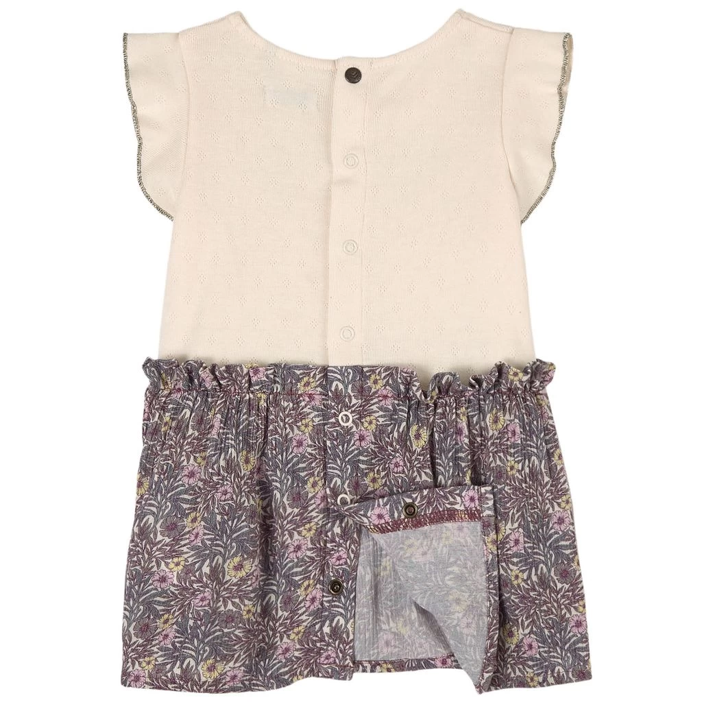 Ecru Floral dress by IKKS. The dress has a mid-waist design. It has a snap button closure at the back, a ruffled elasticated waist, a ribbed crew-neck and flutter sleeves.
