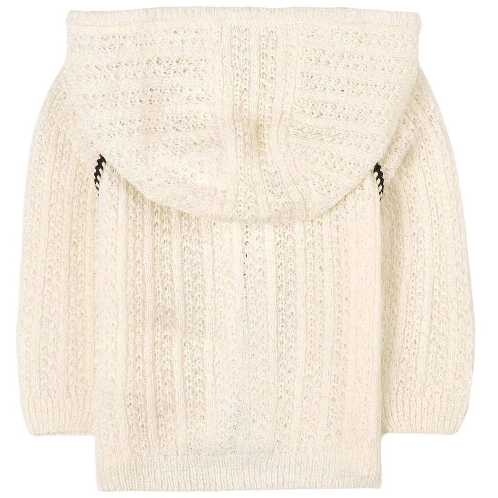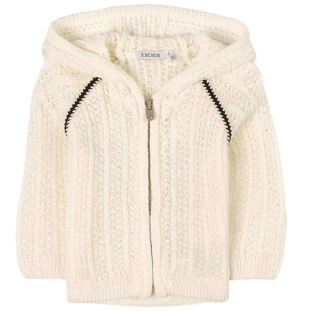 White hooded cardigan by IKKS. The hooded cardigan has a zip closure at the front. It has raglan sleeves, ribbed cuffs and a ribbed hem.