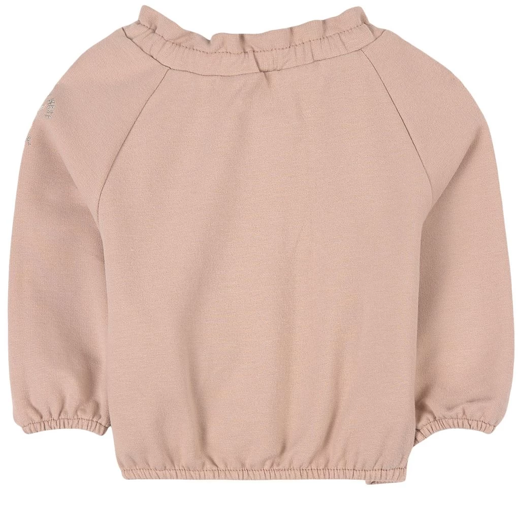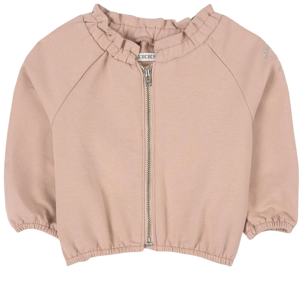 Pink Ruffle sweatshirt by IKKS. The sweatshirt has a zip closure at the front. It has an elasticated ruffle collar, raglan sleeves, an elasticated hem and elasticated cuffs.