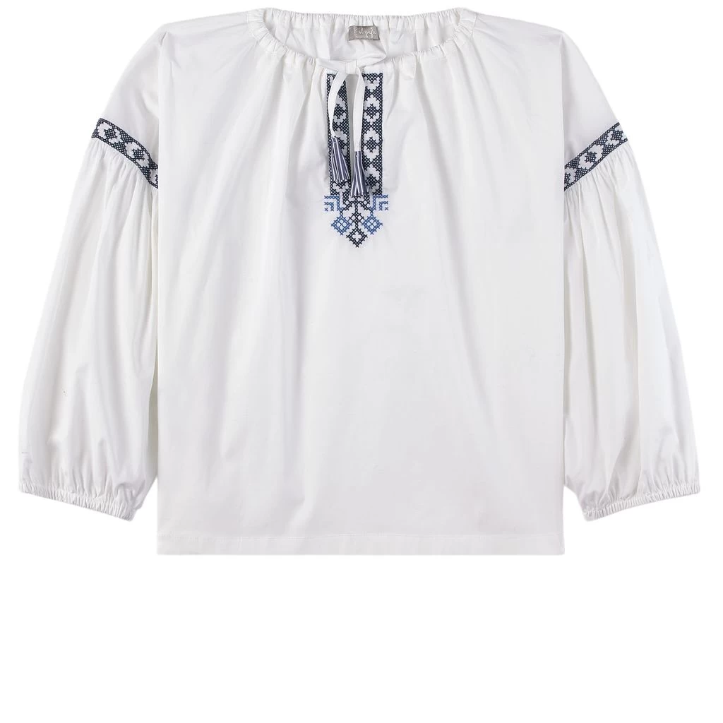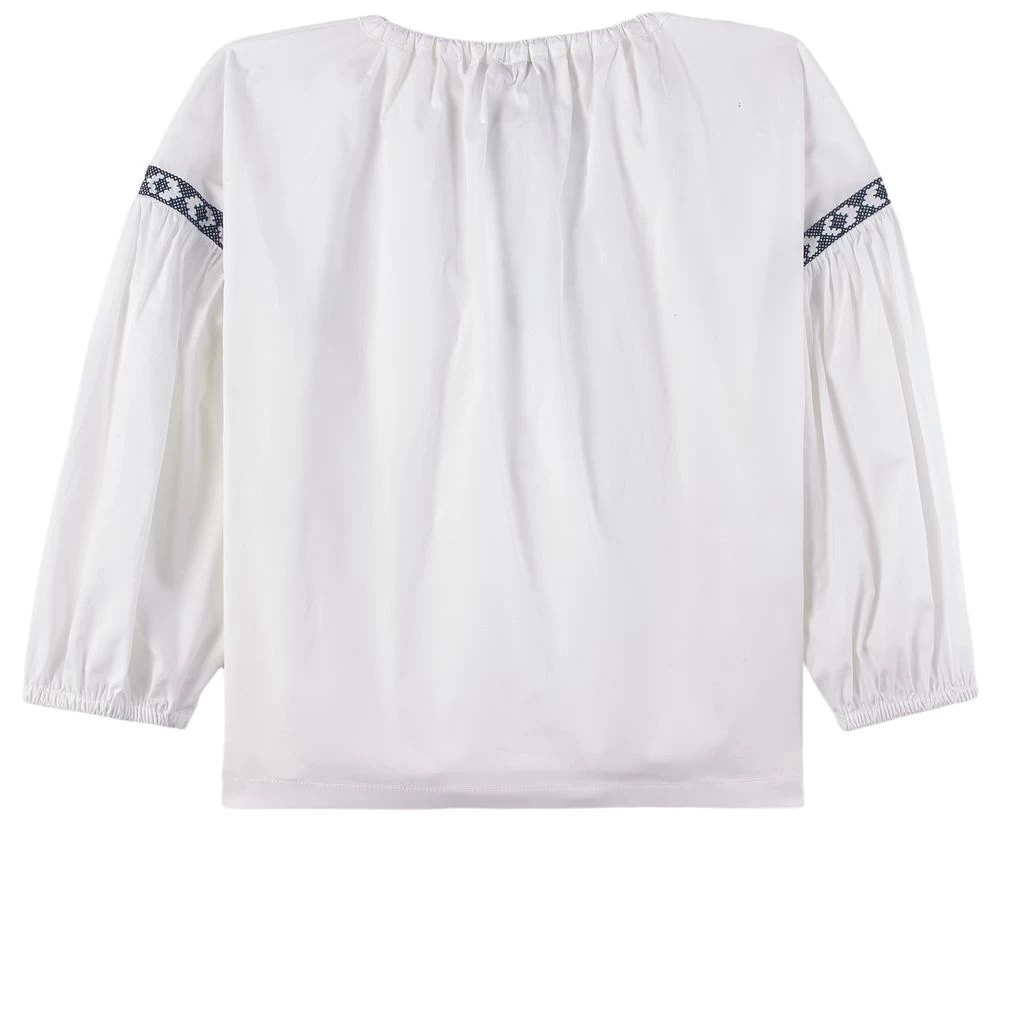 White blouse by Il Gufo. The blouse has three-quarter length sleeves. It has a tie detail at the neckline and elasticated cuffs.