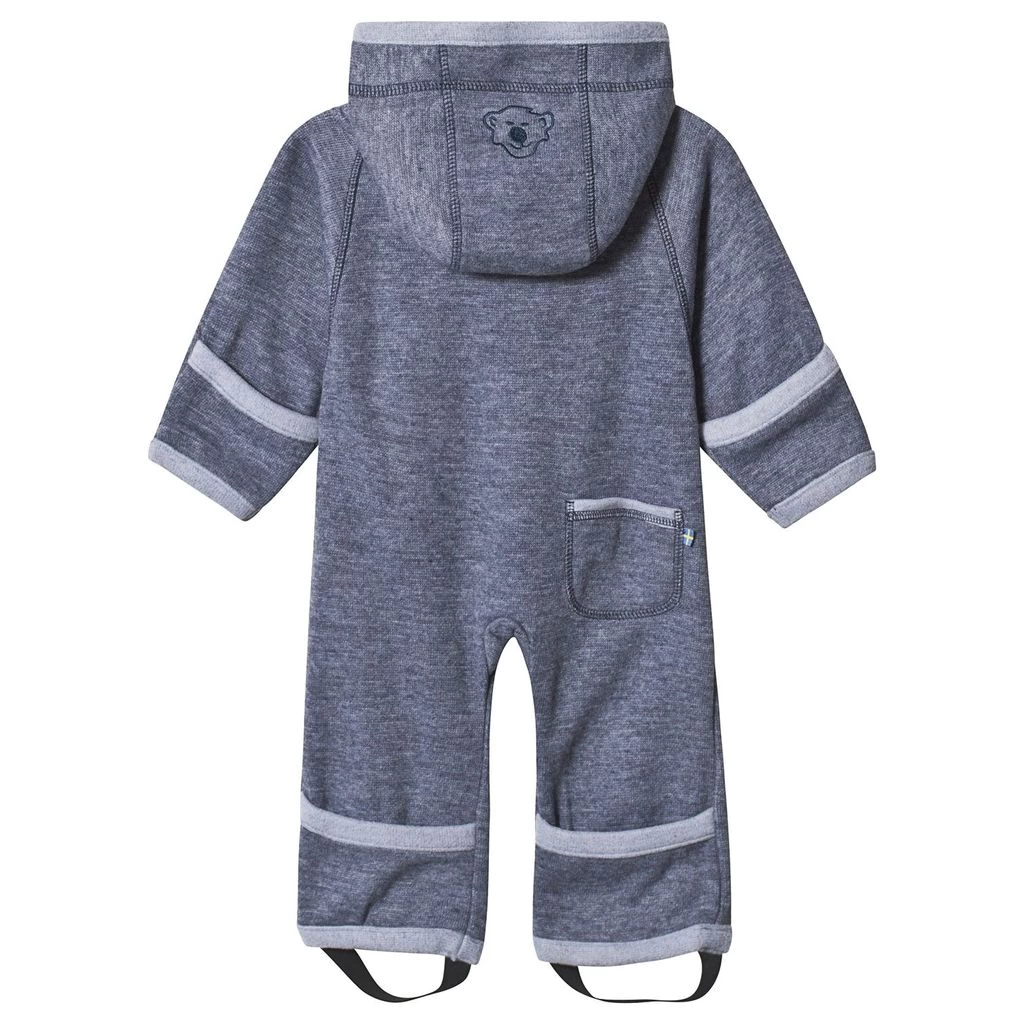 Blue Woolly onesie by Isbjörn of Sweden. The onesie has an attachable hood. It has a zip closure at the front, fold-over cuffs, a back pocket and fixed foot loops.
