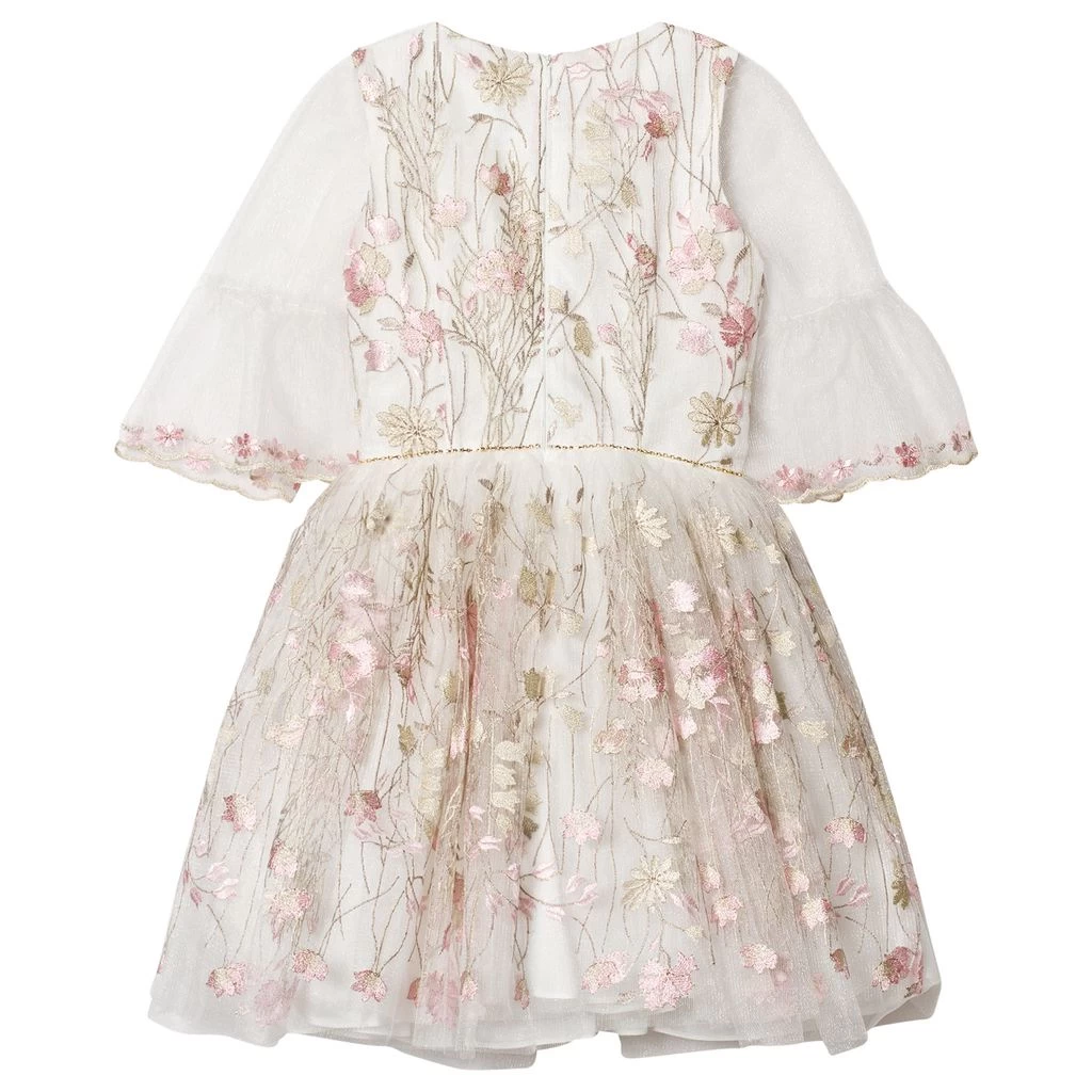 The hallmarks of David Charles are cutting edge design and stylish formalwear and this Ivory Tulle Embroidered Party Dress with Gold Detail is the epitome of these characteristics. Decorated with pink embroidered flowers across the tulle mesh skirt and bodice. The flute detailed sleeves are crafted from white mesh with embroidery at the hem. The skirt is multi-layered for a look which will have them twirling for hours and the back has a hidden zipper for quick and easy changing. Style with pink ballet pumps for a look fit for the most special of occasions.Â