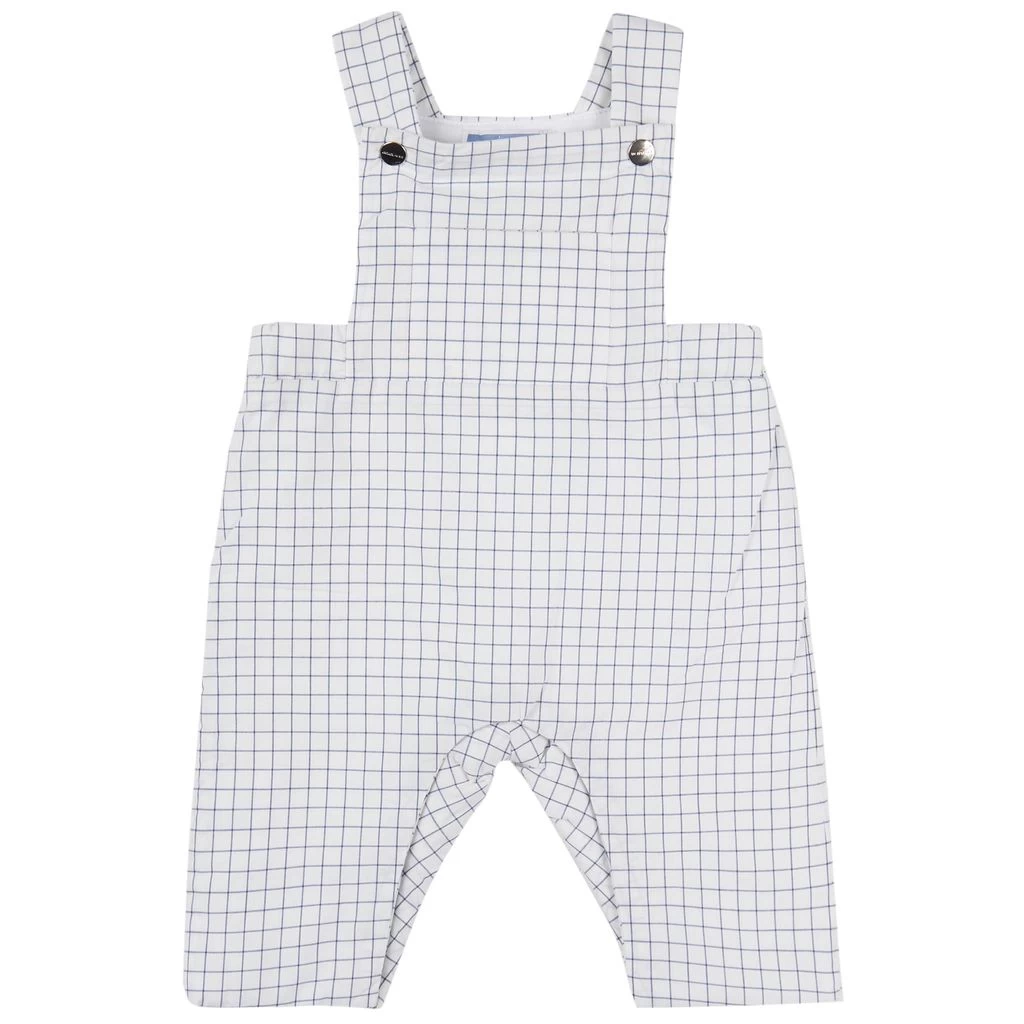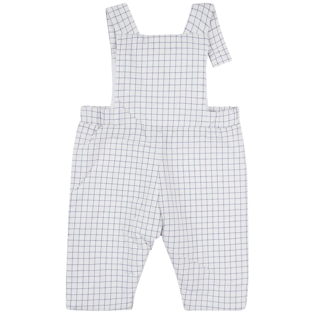 White overalls by Jacadi. The overalls have a checked design. They have snap button closures at the shoulders and between the legs.