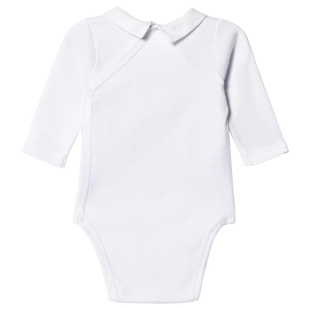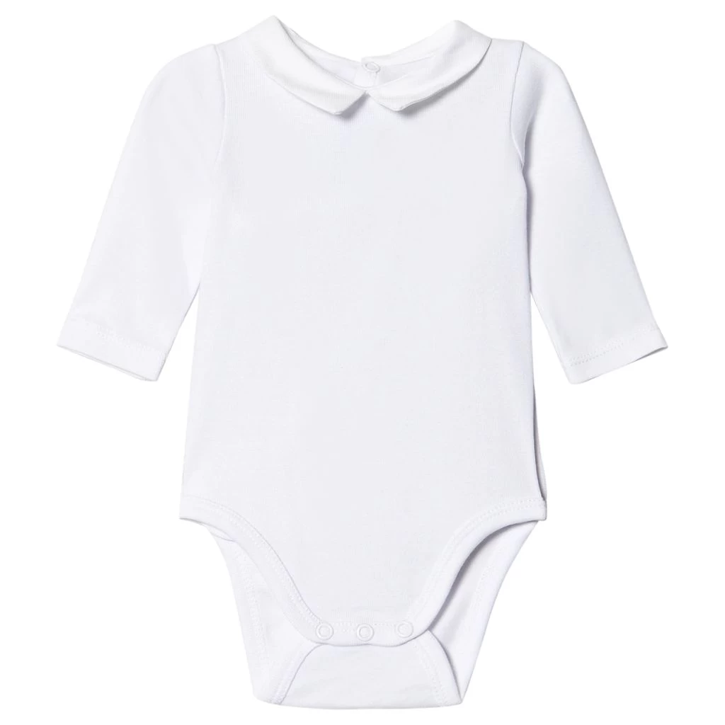 White baby body by Jacadi. The baby body has a woven collar. It has a snap button closure at the back and between the legs.