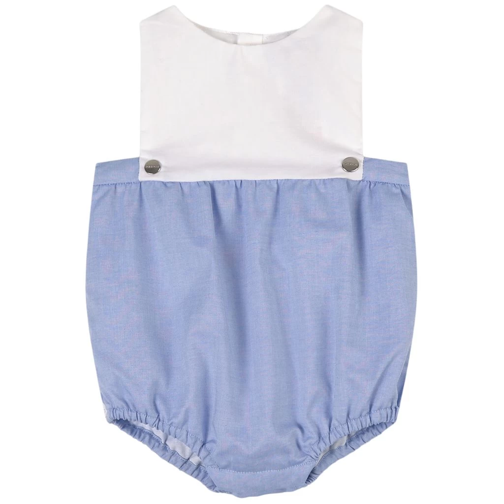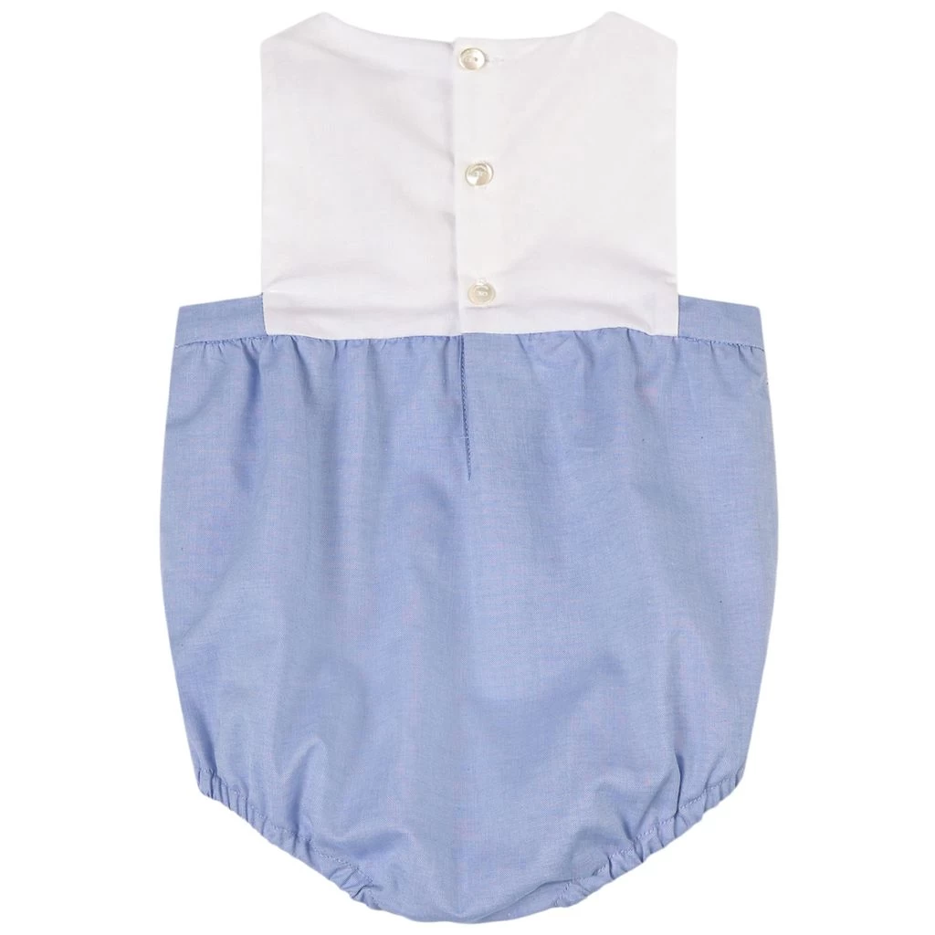 Blue Colorblock romper by Jacadi. The romper has a poplin lining. It has a snap button closure between the legs.