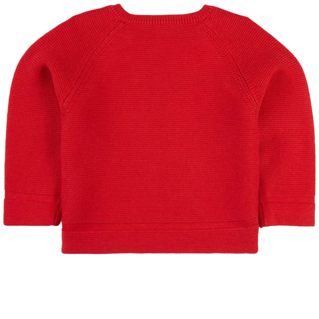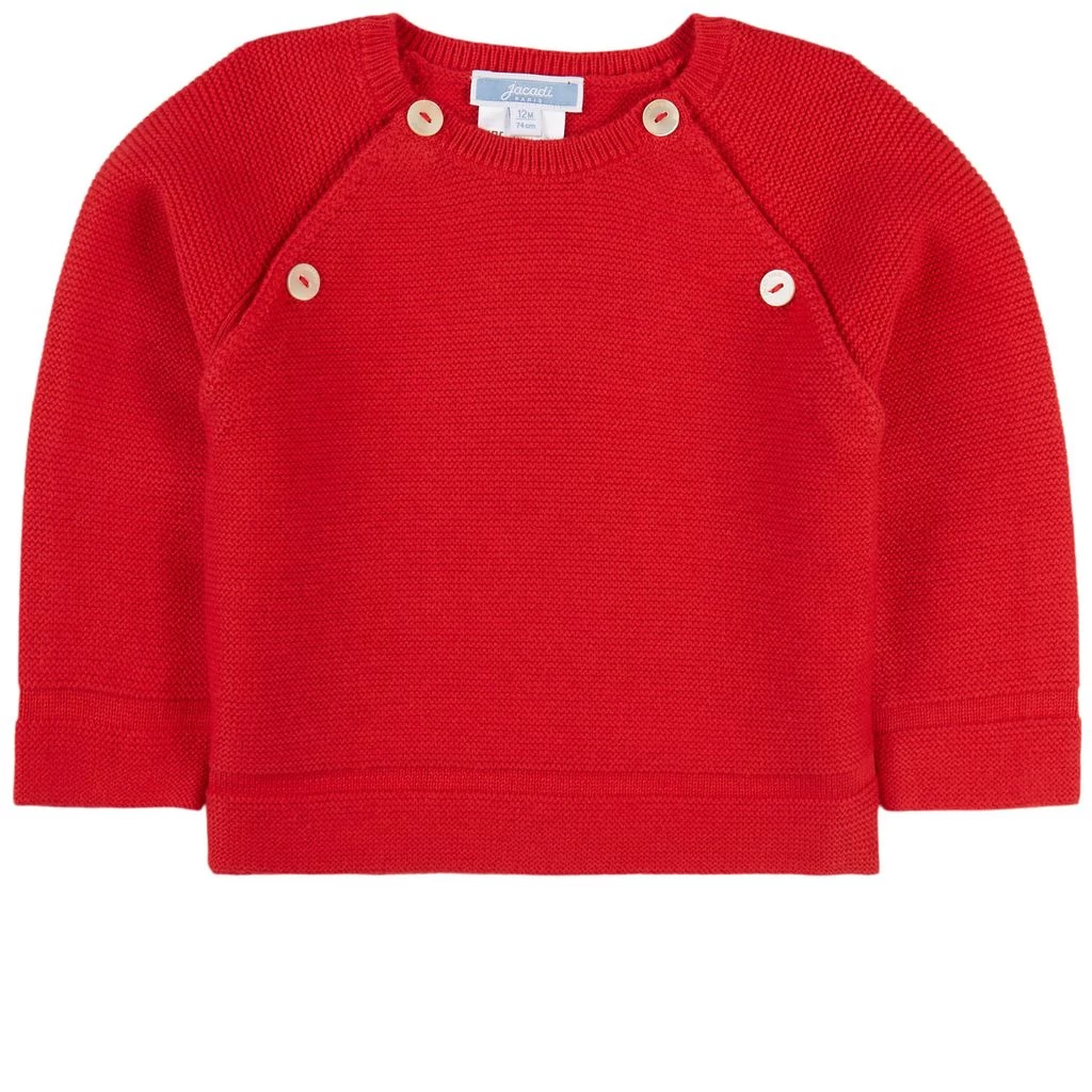 Red Garter Stitch knitted sweater by Jacadi. The knitted sweater has a fine knit. It has a button closure at the front and ribbed cuffs and hem.
