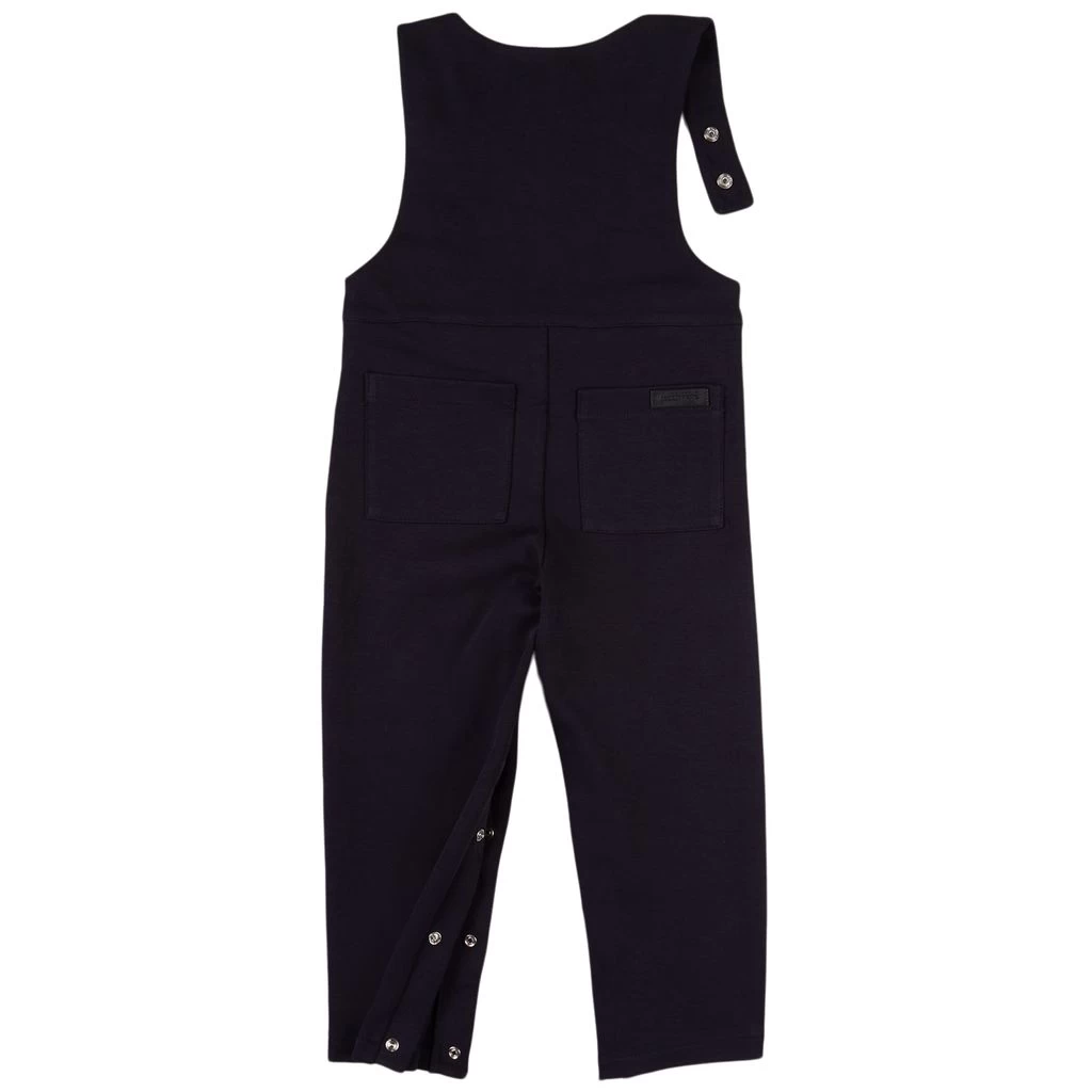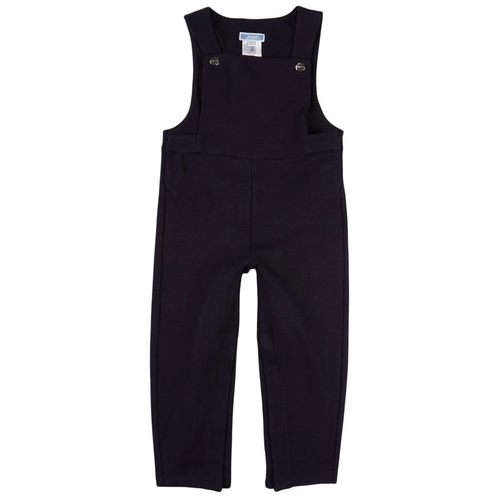 Blue Interlock overalls by Jacadi. The overalls have two back pockets. They have snap button closures at the shoulders and between the legs.