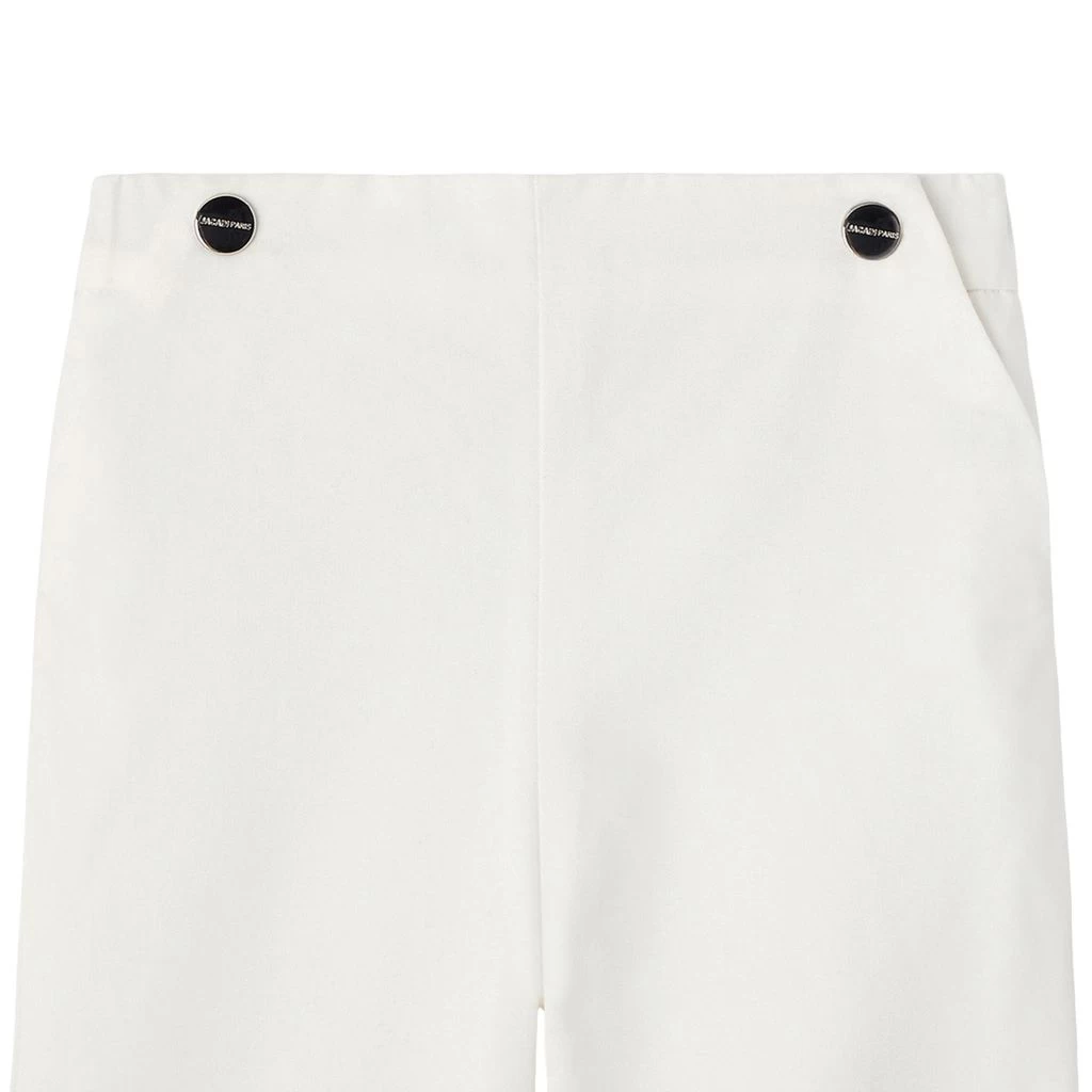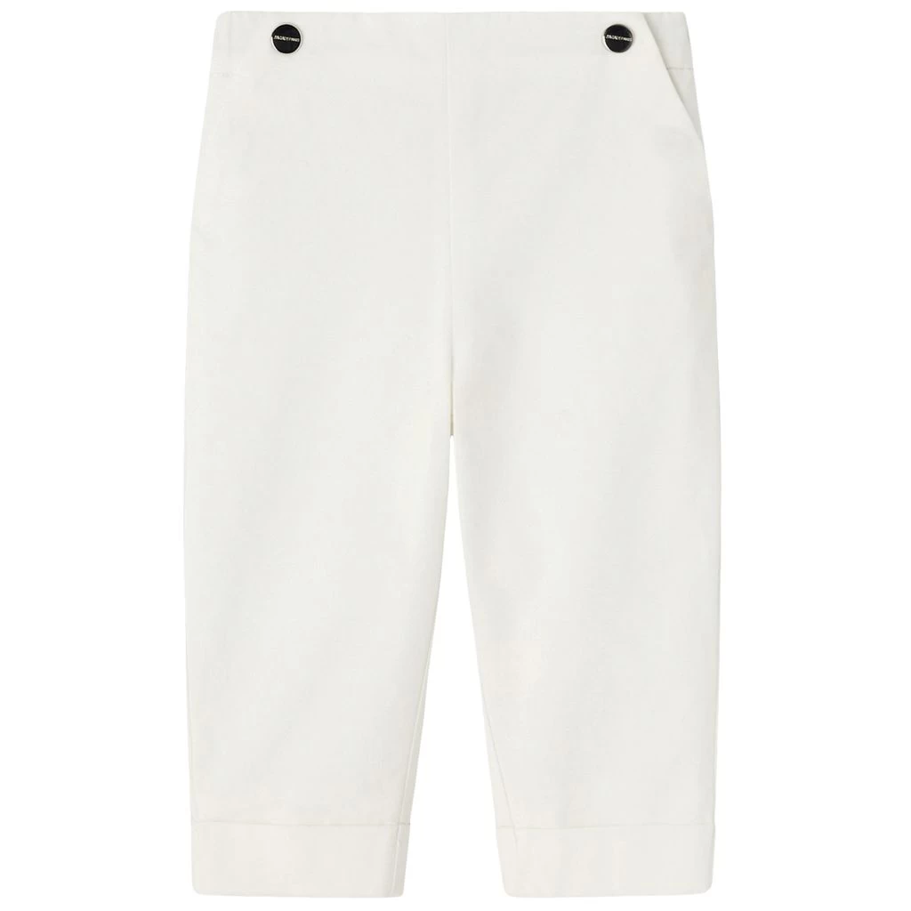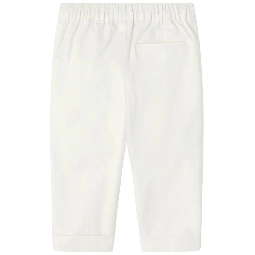 Wear it for a stylish look this season. White Maestro trousers by Jacadi. The trousers have an elasticated waist. They have a snap button closure at the sides, folded cuffs and a back pocket.