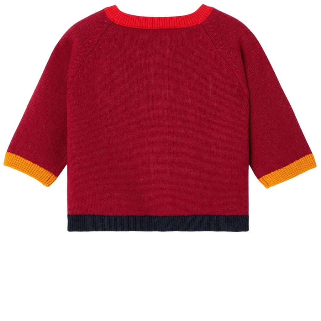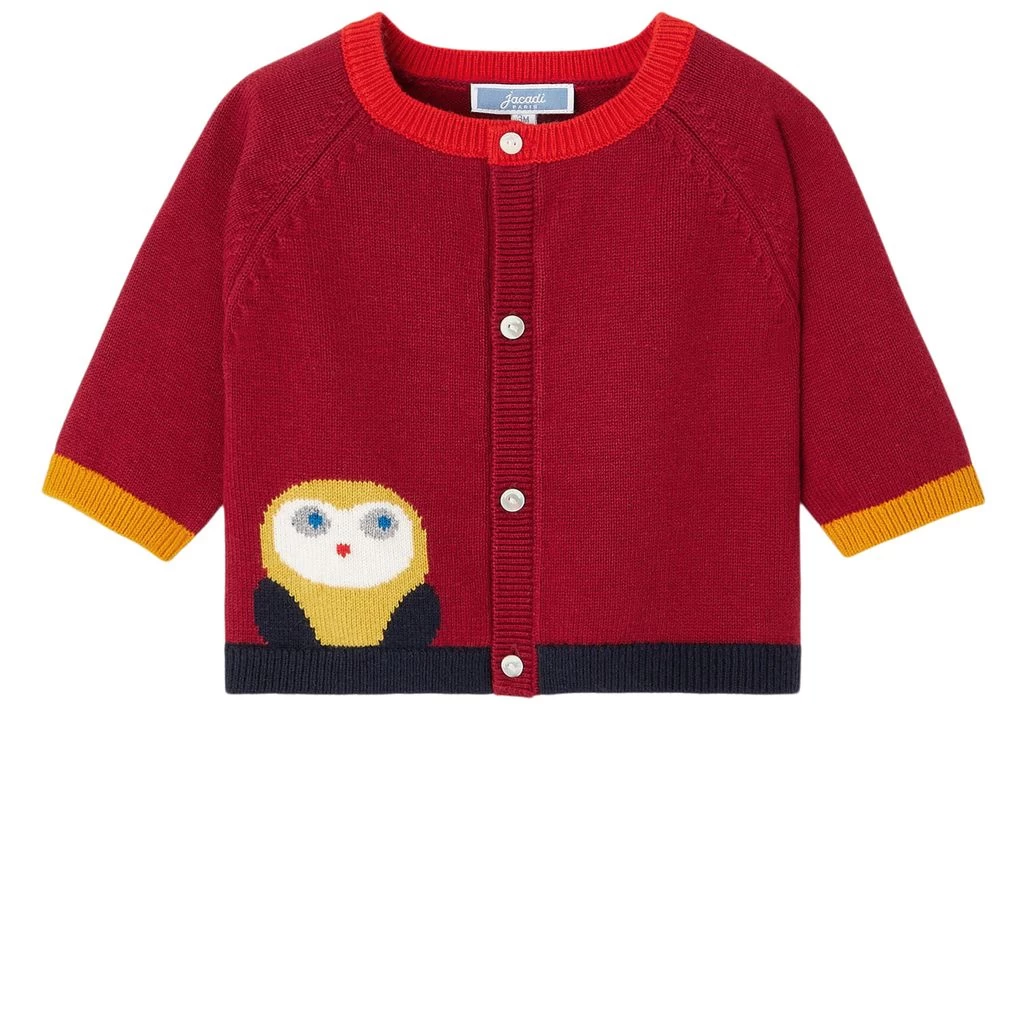 Nice and cozy cardigan!. Red Mateo baby cardigan by Jacadi. The baby cardigan has a knitted design. It has a button closure at the front, contrasting trims and an intarsia graphic on the bottom front.