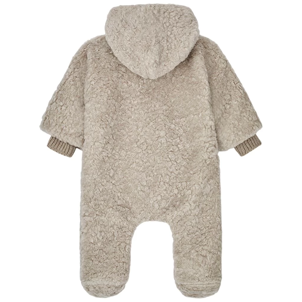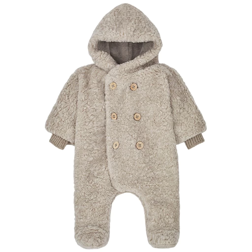 Keep your little baby warm on colder days. Beige Joris coverall by 1+ In The Family. The coverall has a soft faux shearling material. It has a fleece lining, a fixed hood, a button closure at the front and ribbed cuffs.