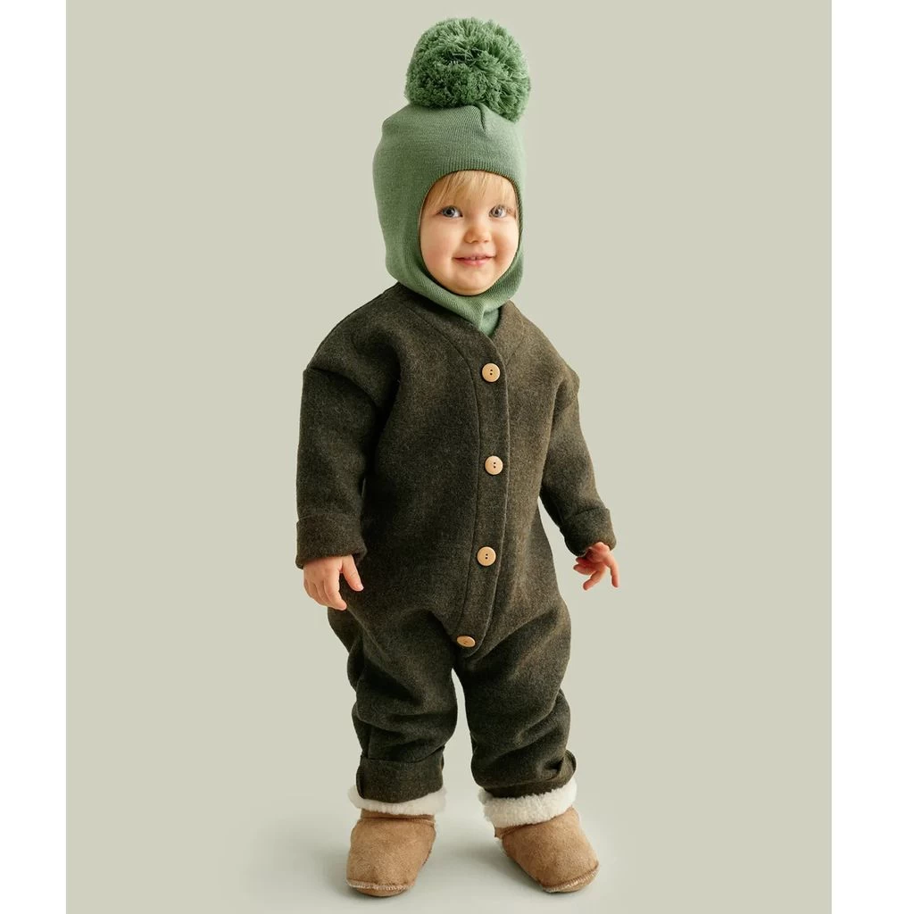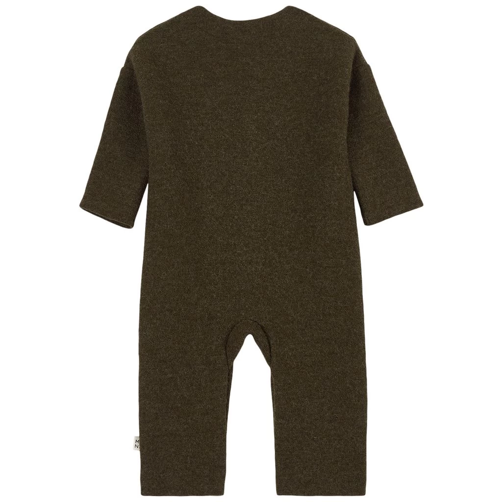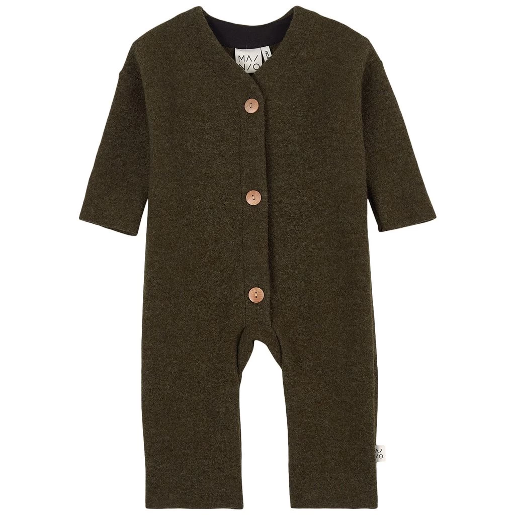 Wool brings you warmth and comfort. Dark green jumpsuit by MAINIO. The jumpsuit has a button closure at the front.