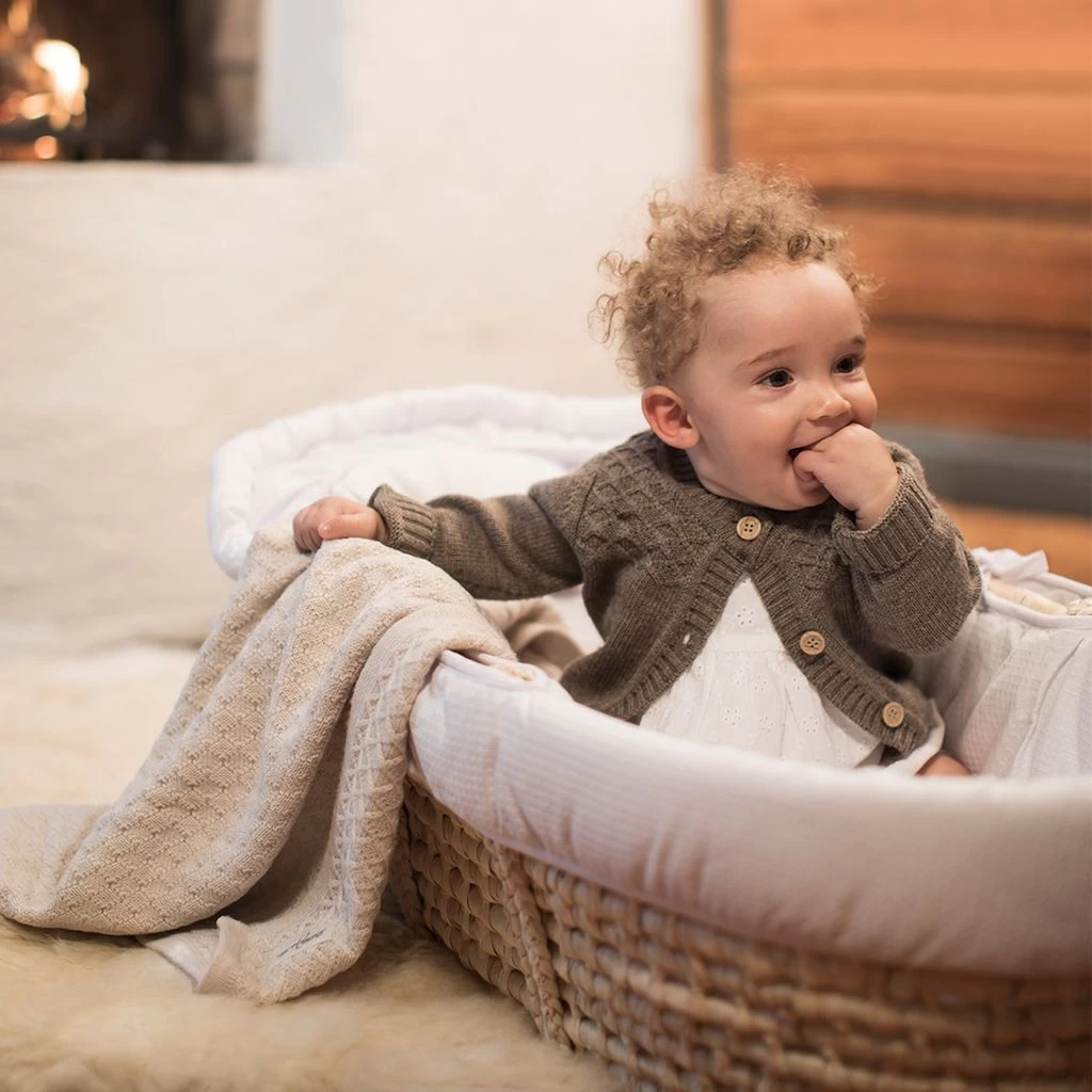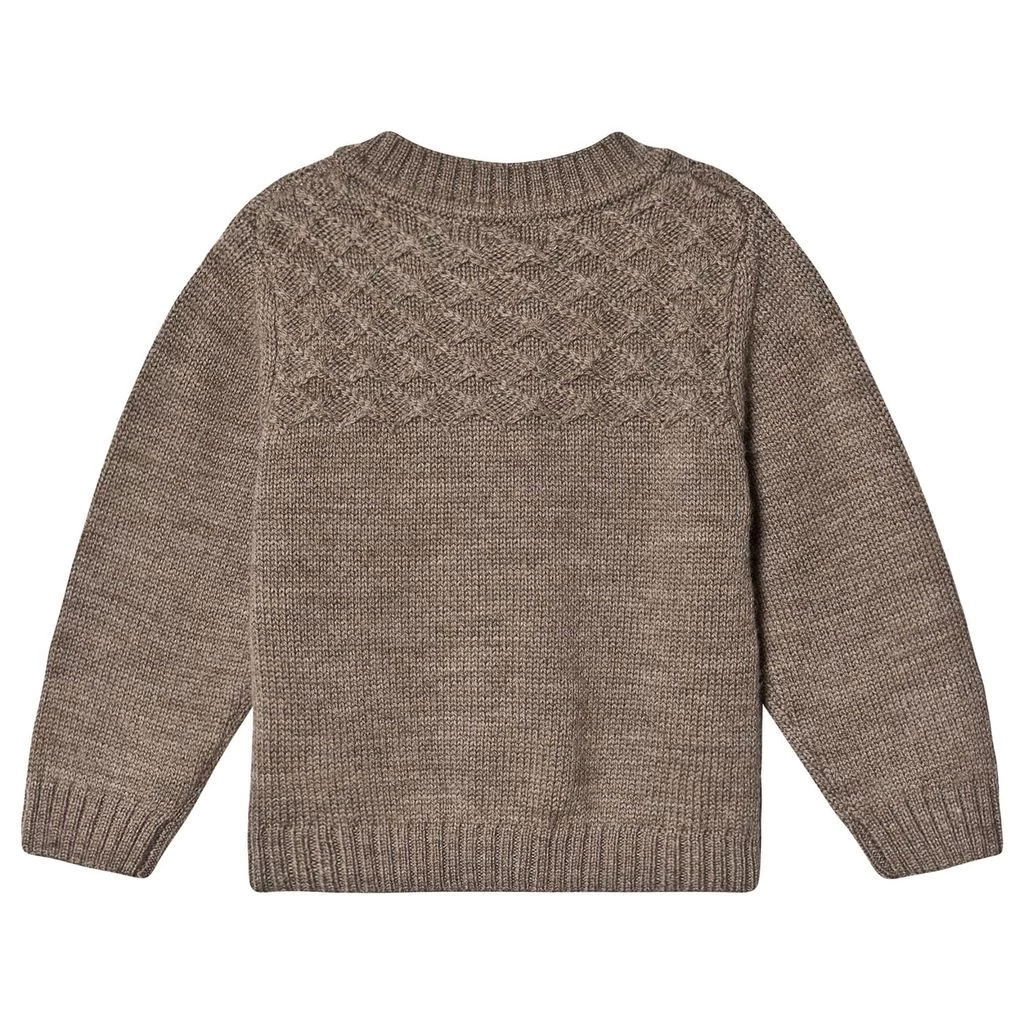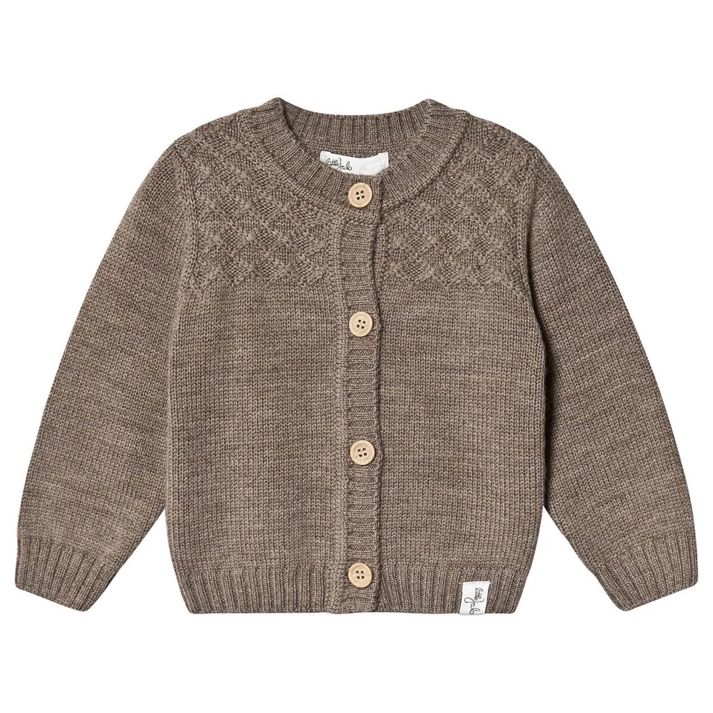 Brown knit cardigan by Little Jalo. The cardigan has a knitted design. It has wooden buttons at the front and rib-knit cuffs.