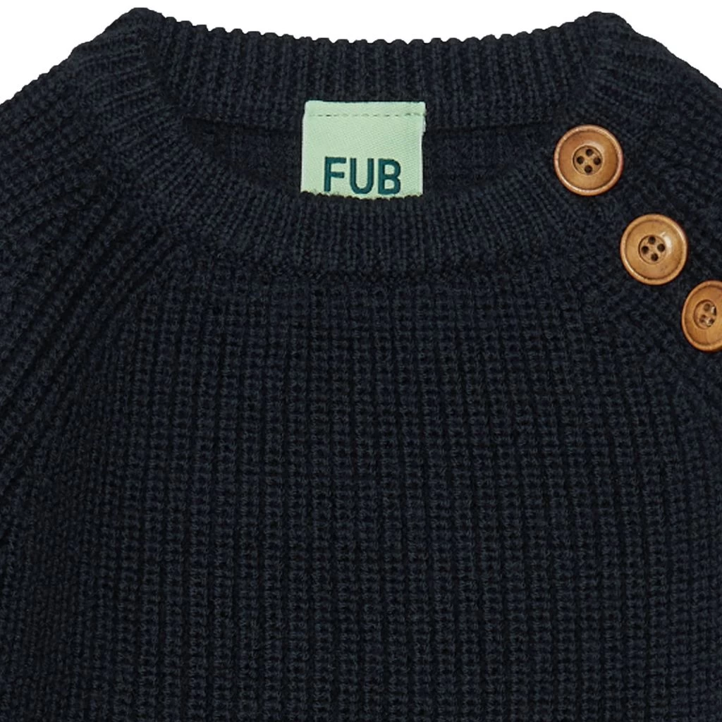 Your little baby will love the soft knitted feel. Navy knit jumper by FUB. The jumper has a rib-knit design. It has a button closure at the shoulder.