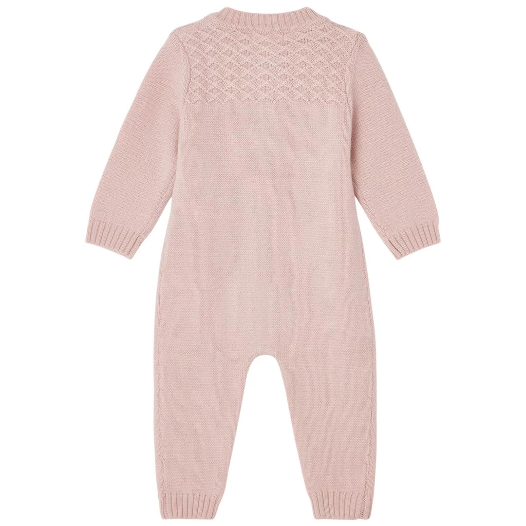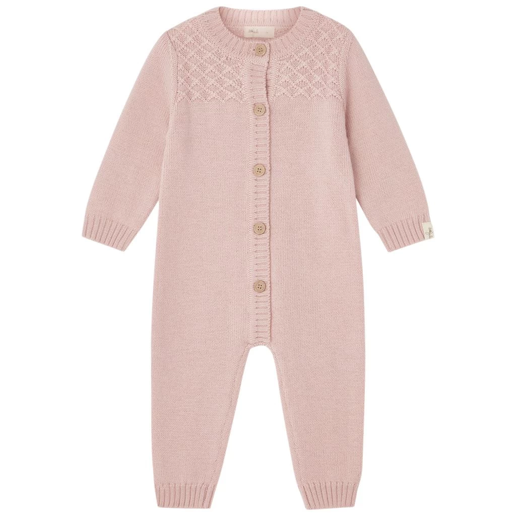 Wool brings you warmth and comfort. Pink onesie by Little Jalo. The onesie has a knitted design. It has wooden buttons at the front and rib-knit cuffs.