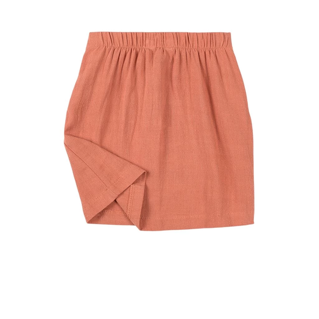 Orange Koro skirt by Jellymade. The skirt is made in Portugal and has an elasticated waist. It has button closures at the sides.