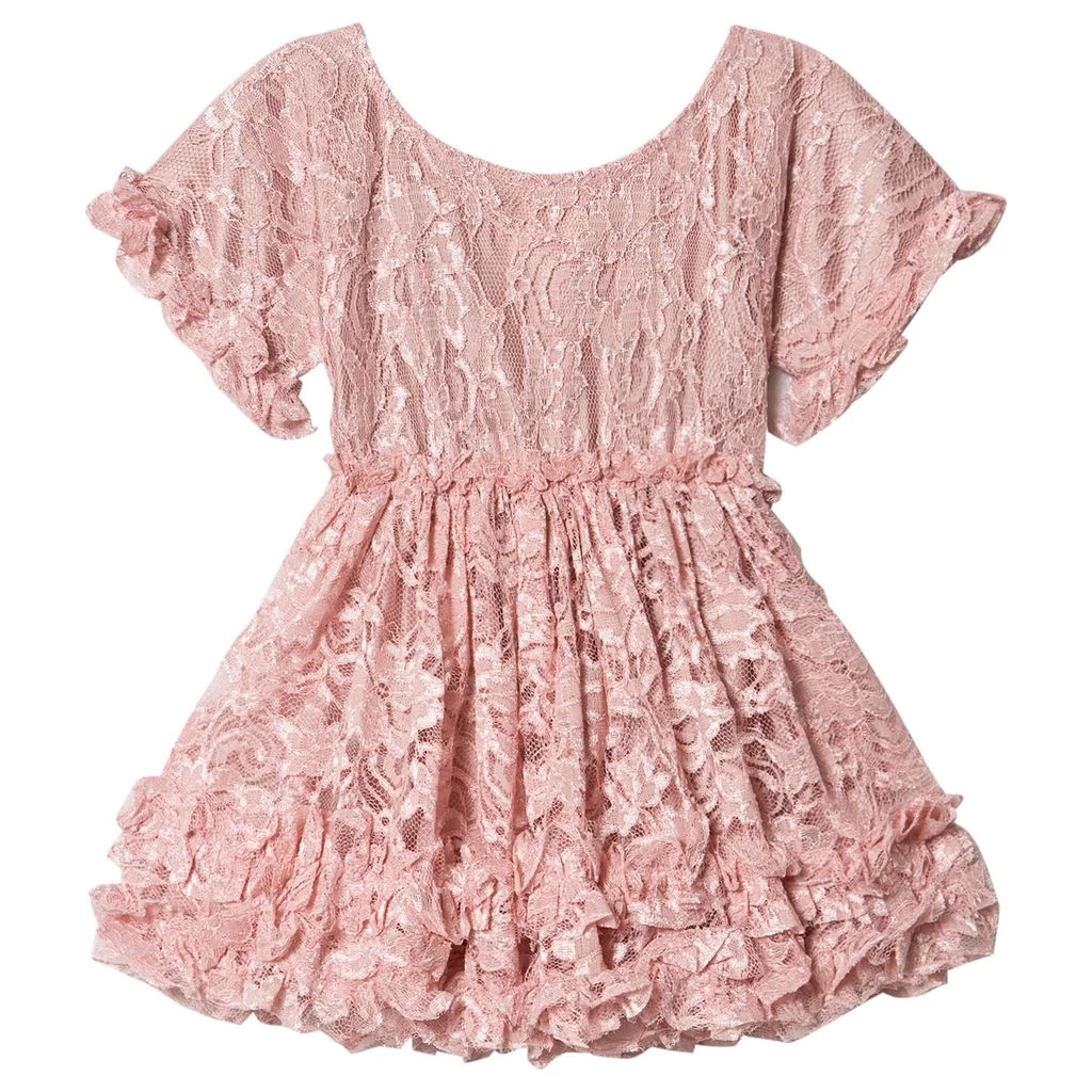 Pink Lacy Frilly Dress by Dolly by Le Petit Tom. The dress has a gathered, elasticated waist.