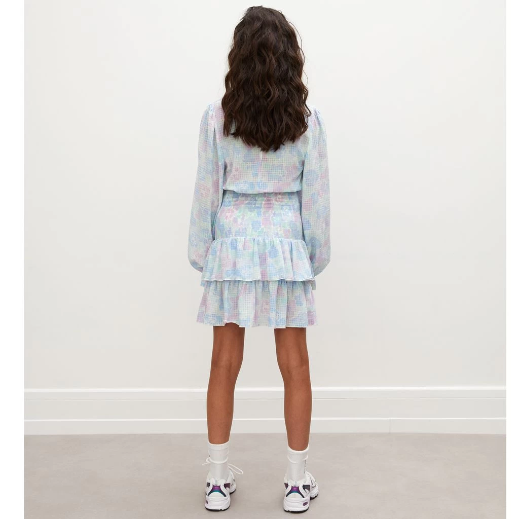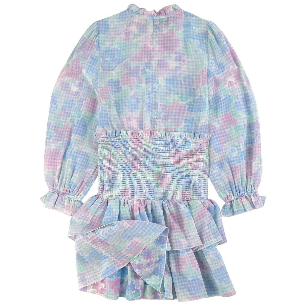 White Dunica dress by Les Coyotes De Paris. The dress has a ruffled stand-up collar. It has a button closure at the front, a smocked waist, a flounced tiered design skirt area and ruffled elasticated cuffs.
