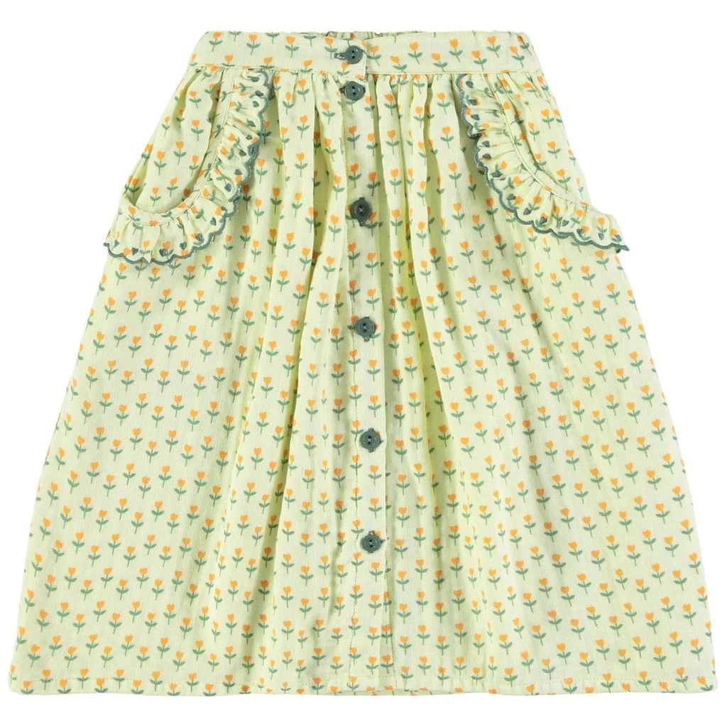 Look amazing in this fashionable skirt. Yellow skirt by Piupiuchick. The skirt is made in Portugal and has ruffle details. It has a floral all-over print and a button closure at the front.