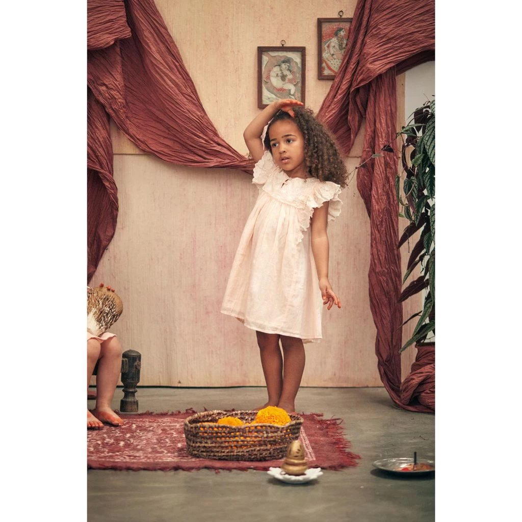 Dress up for special occasions. Pink Hasha dress by Louise Misha. The dress has soft lining. It has ruffle sleeves, a button closure at the back, a gathered empire waist and flower embroidery at the front.