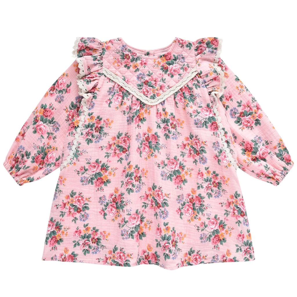 A dress for every occasion. Pink Lara dress by Louise Misha. The dress has a floral all-over print. It has an A-line silhouette, a button closure at the back, elasticated cuffs and a ruffle at the shoulders and at the hem.