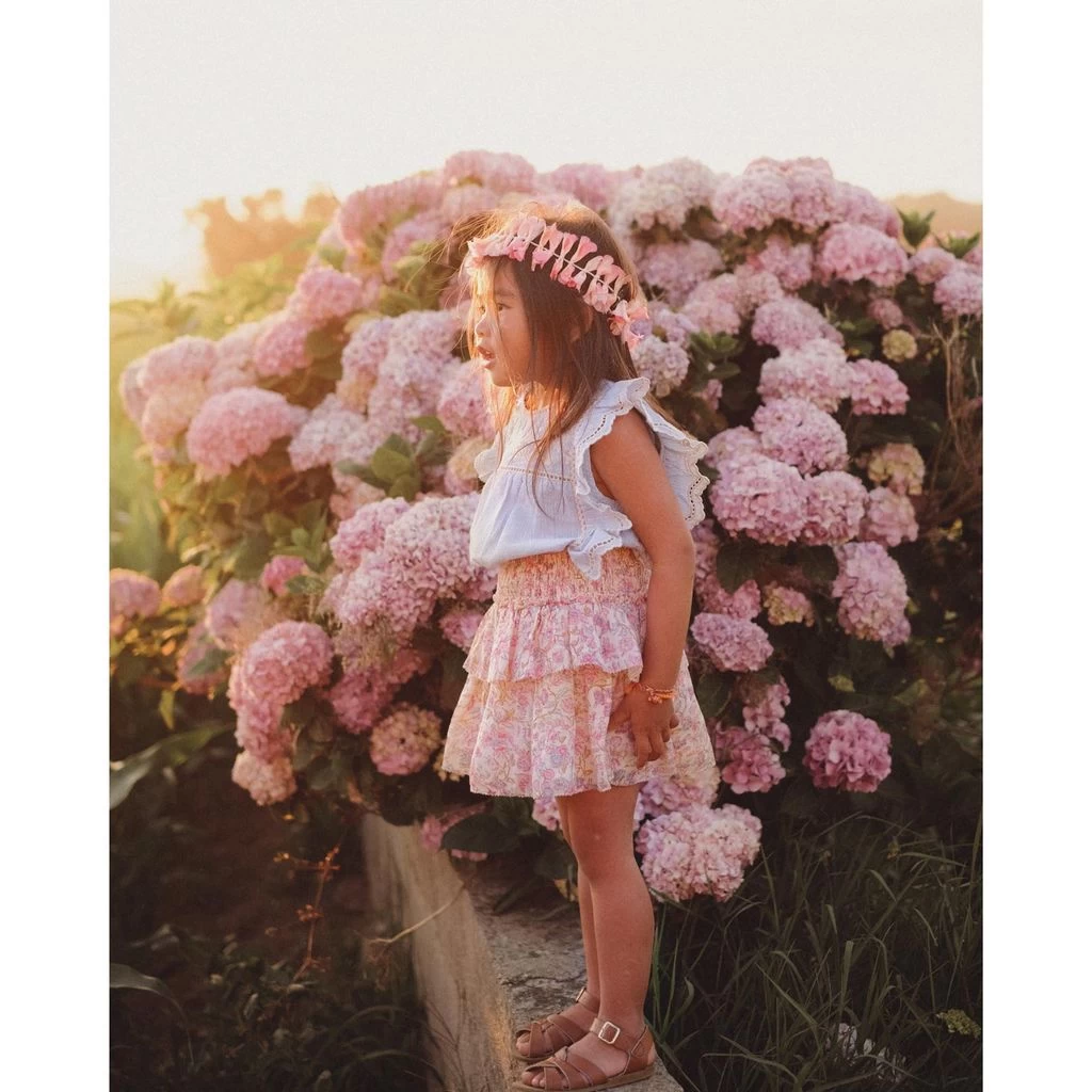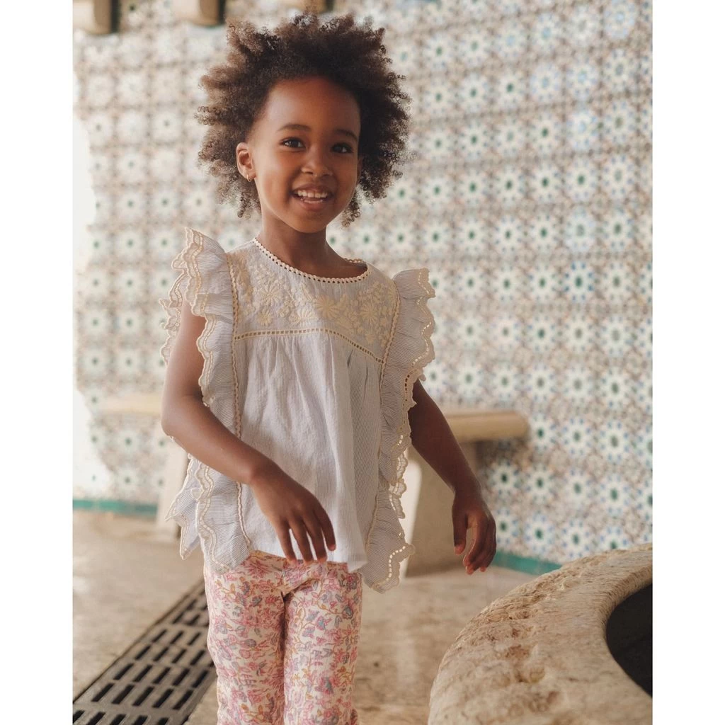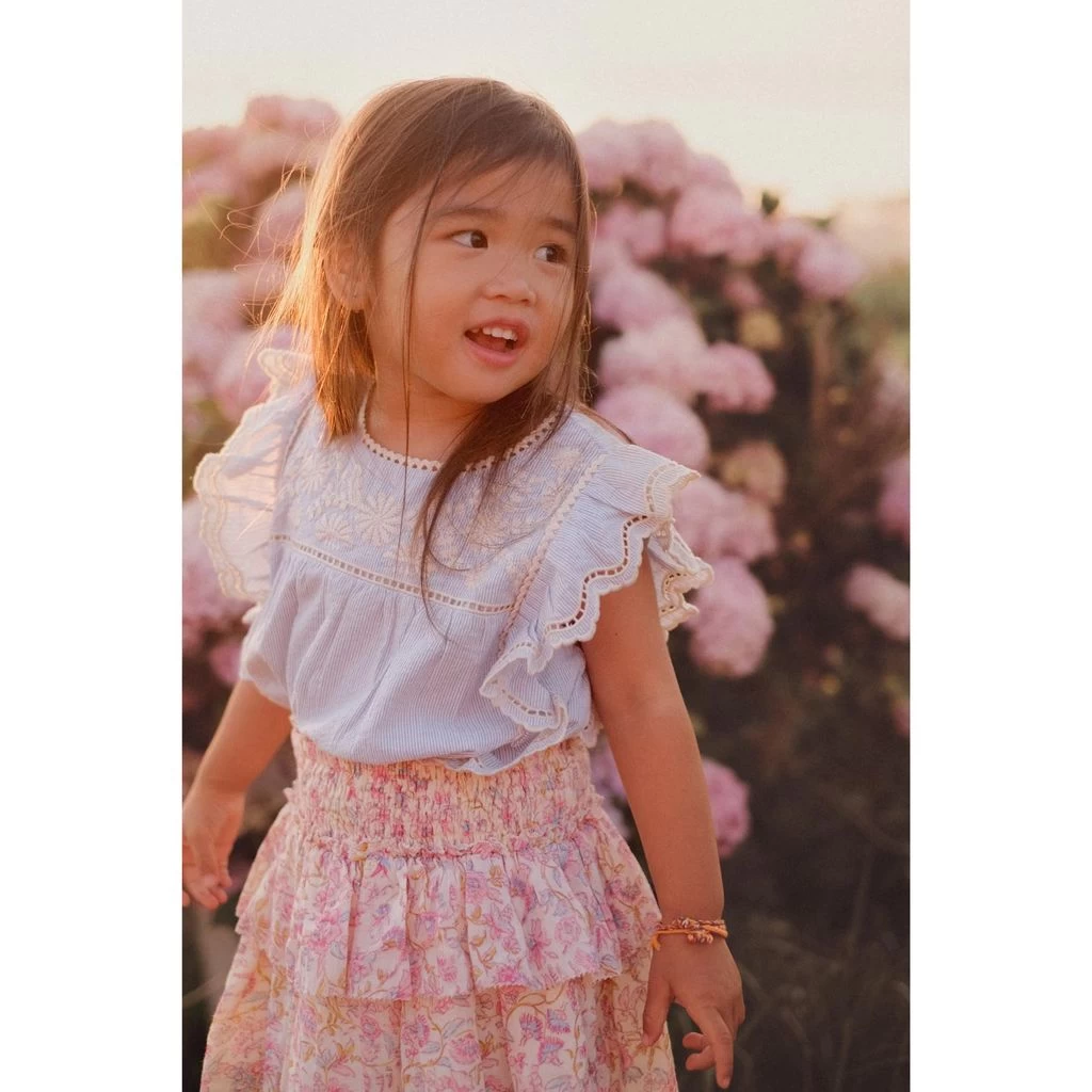 Dress up for special occasions. Blue Mala blouse by Louise Misha. The blouse has ruffles at the sides. It has a button closure at the back, a gathered empire waist and flower embroidery at the front.
