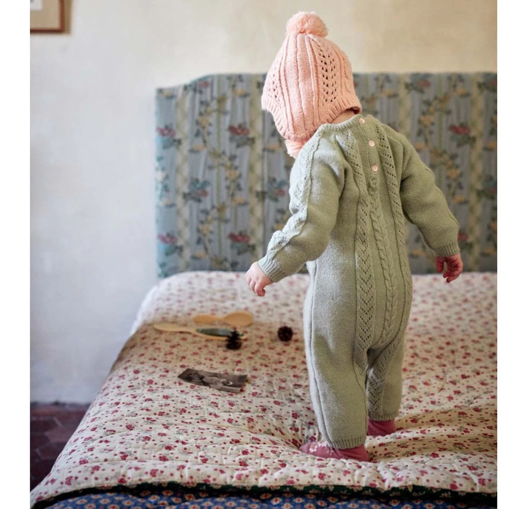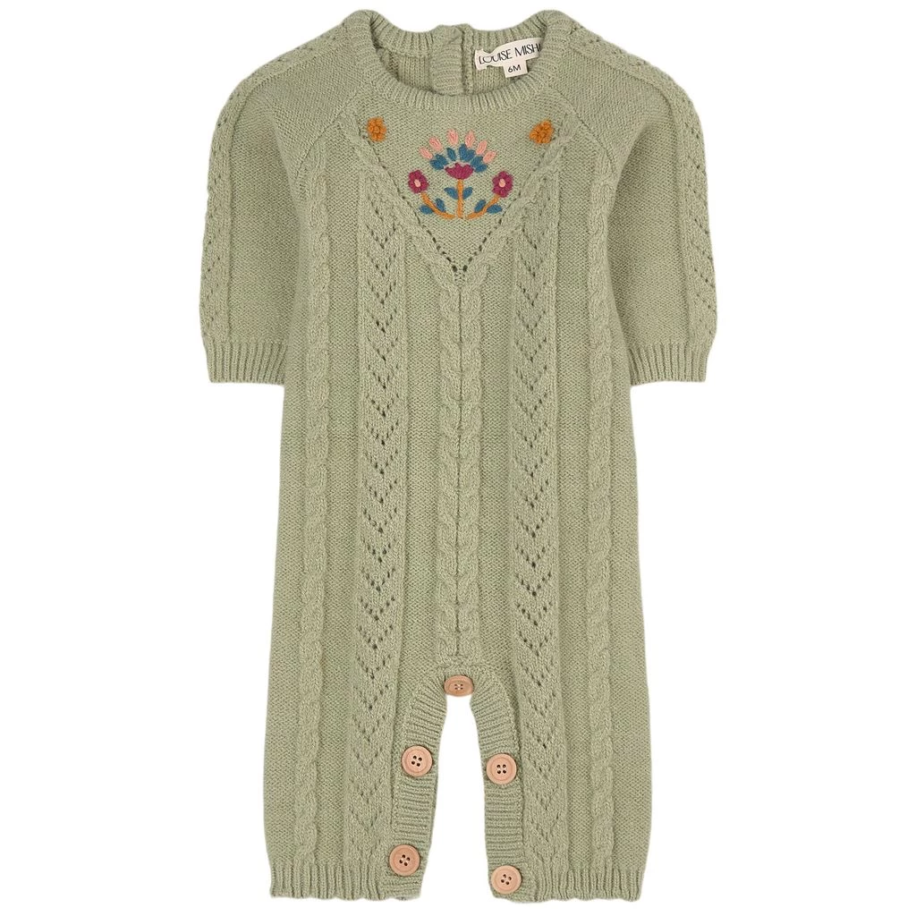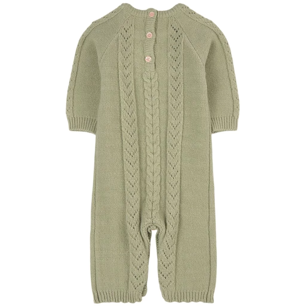Your little one can play all day in comfort. Khaki Misouka onesie by Louise Misha. The onesie has a knitted design. It has a button closure at the back and between the legs and rib-knit cuff.