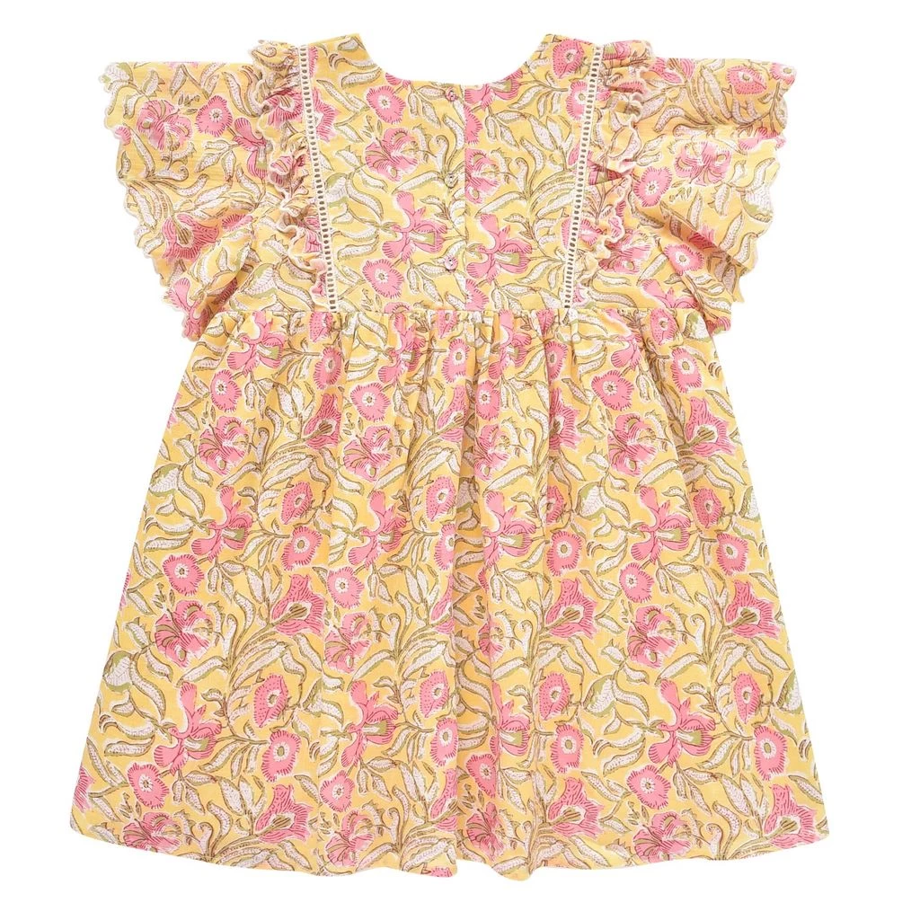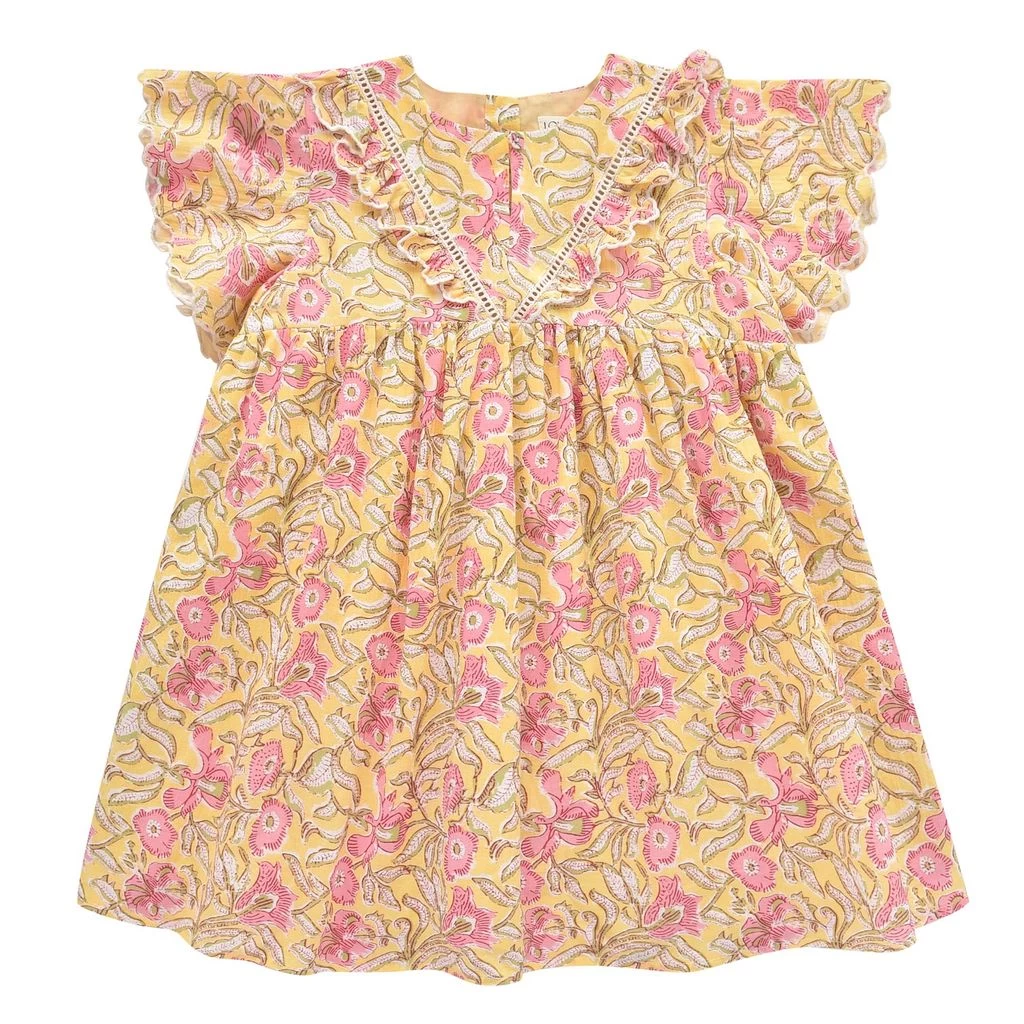 A dress for every occasion. Yellow Siloe dress by Louise Misha. The dress has a floral all-over print. It has soft lining, a button closure at the back, scalloped sleeves and a gathered waist.
