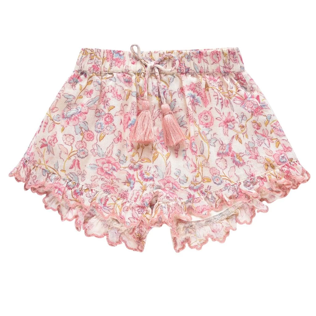 The perfect shorts for a sunny day with friends. Pink Vallaloid shorts by Louise Misha. The shorts have an elasticated waist. They have ruffles at the leg ends.