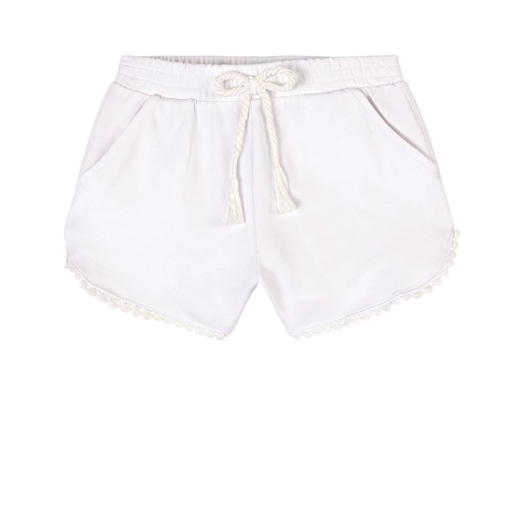 White Chenille shorts by Mayoral. The shorts have an elasticated waist. They have two front pockets, two back pockets and a lace trim at the leg ends.