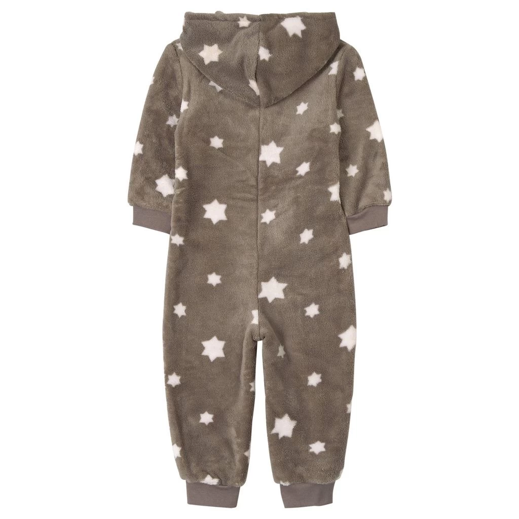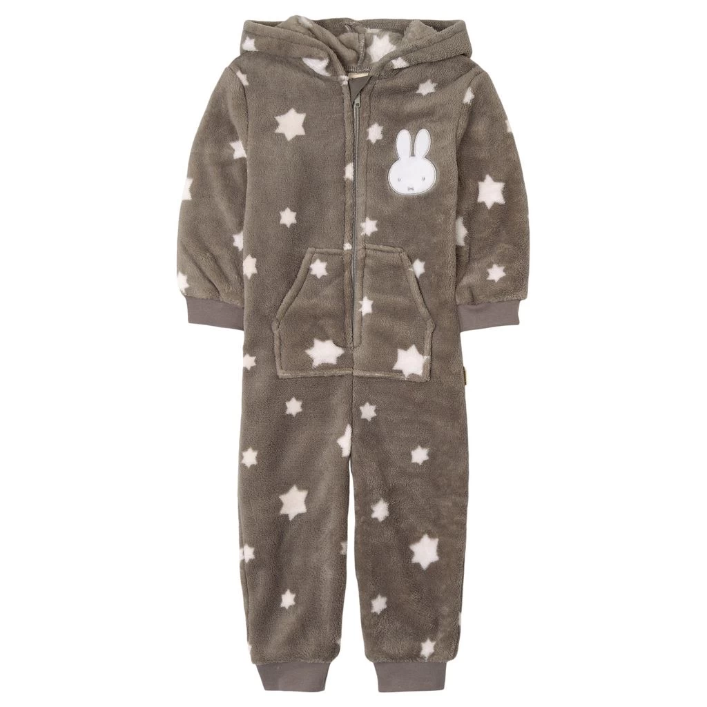 Grey Miffy onesie by Miffy. The onesie has a soft fleece material. It has a fixed hood with playful ears, a zip closure at the front, a drawstring waist, ribbed cuffs and a logo on the chest.