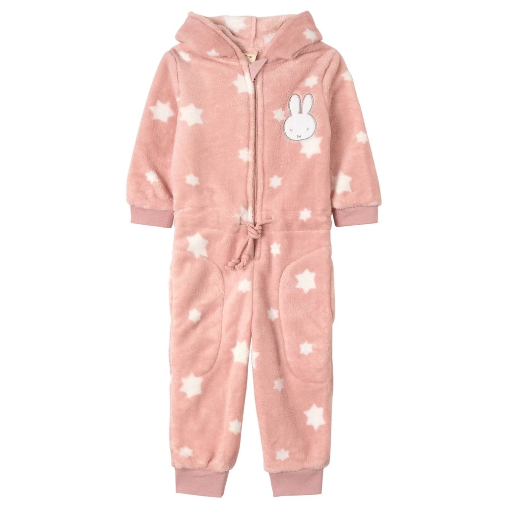 Pink Miffy onesie by Miffy. The onesie has a soft fleece material. It has a fixed hood with playful ears, a zip closure at the front, a drawstring waist, ribbed cuffs and a logo on the chest.