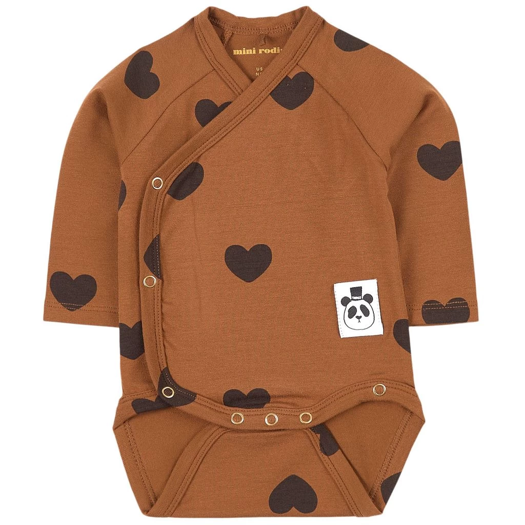 Brown Basic Heart baby body by Mini Rodini. The baby body has a wrap front. It has a snap button closure between the legs and at the front, raglan sleeves and a logo detail at the front.