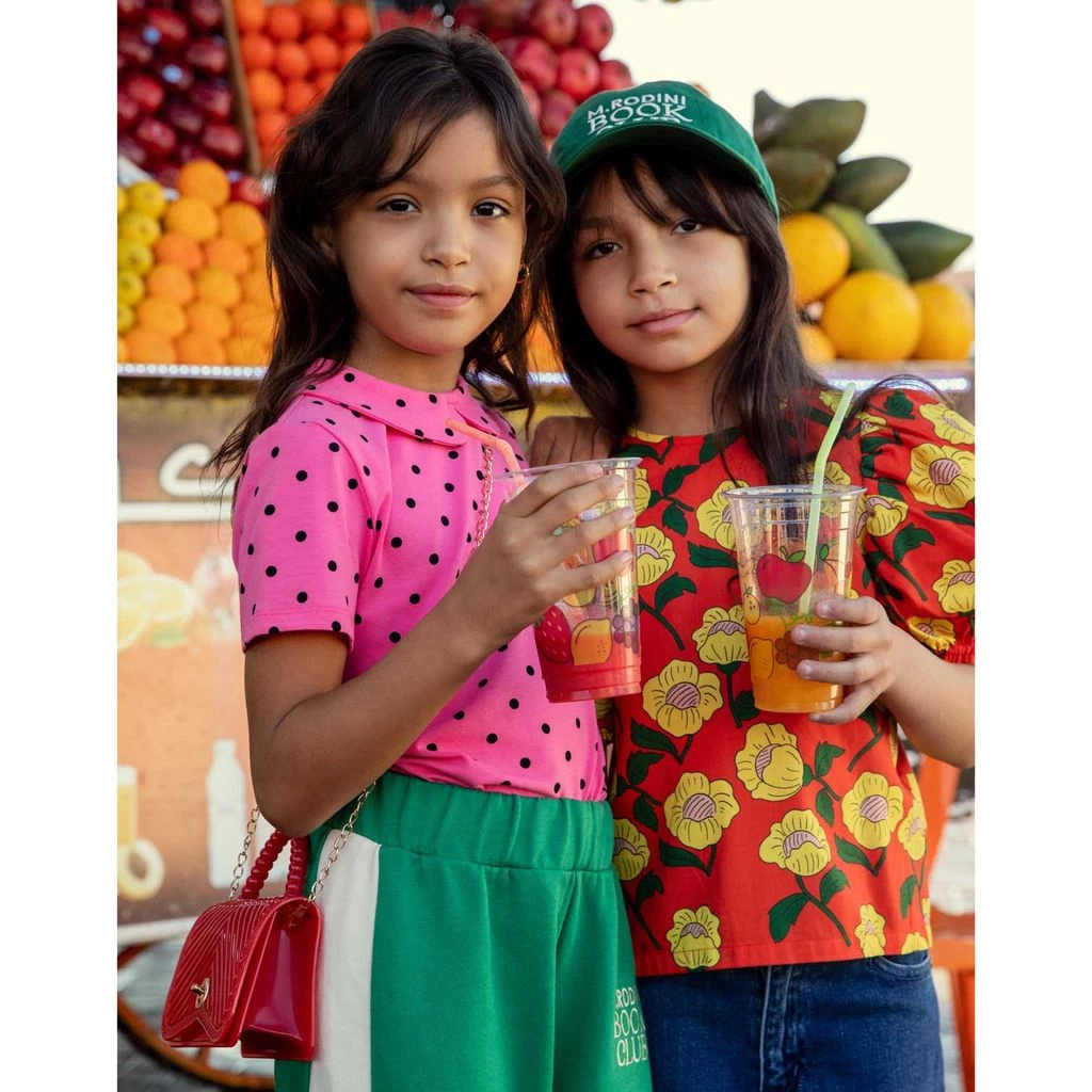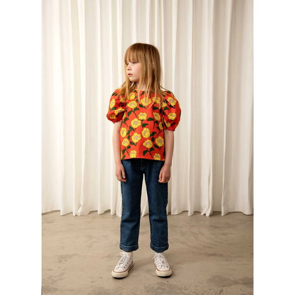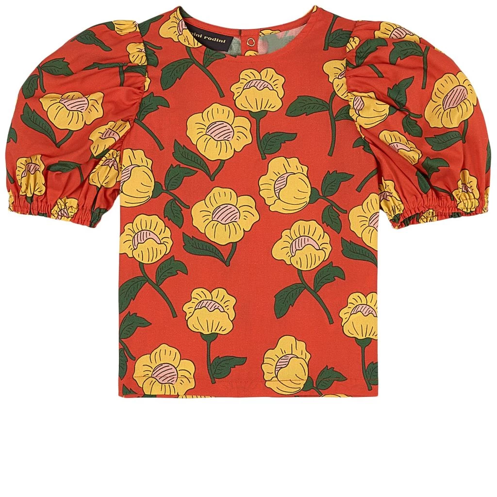 Eco-friendly fashion at its finest!. Orange top by Mini Rodini. The top has a floral all-over print. It has puff sleeves and snap buttons at the back.