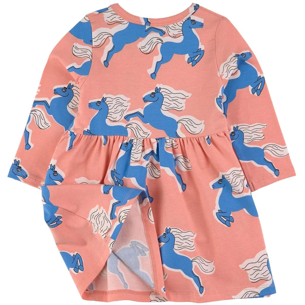A dress for every occasion. Pink dress by Mini Rodini. The dress has a playful all-over print. It has a gathered waist and a snap button placket at the front.