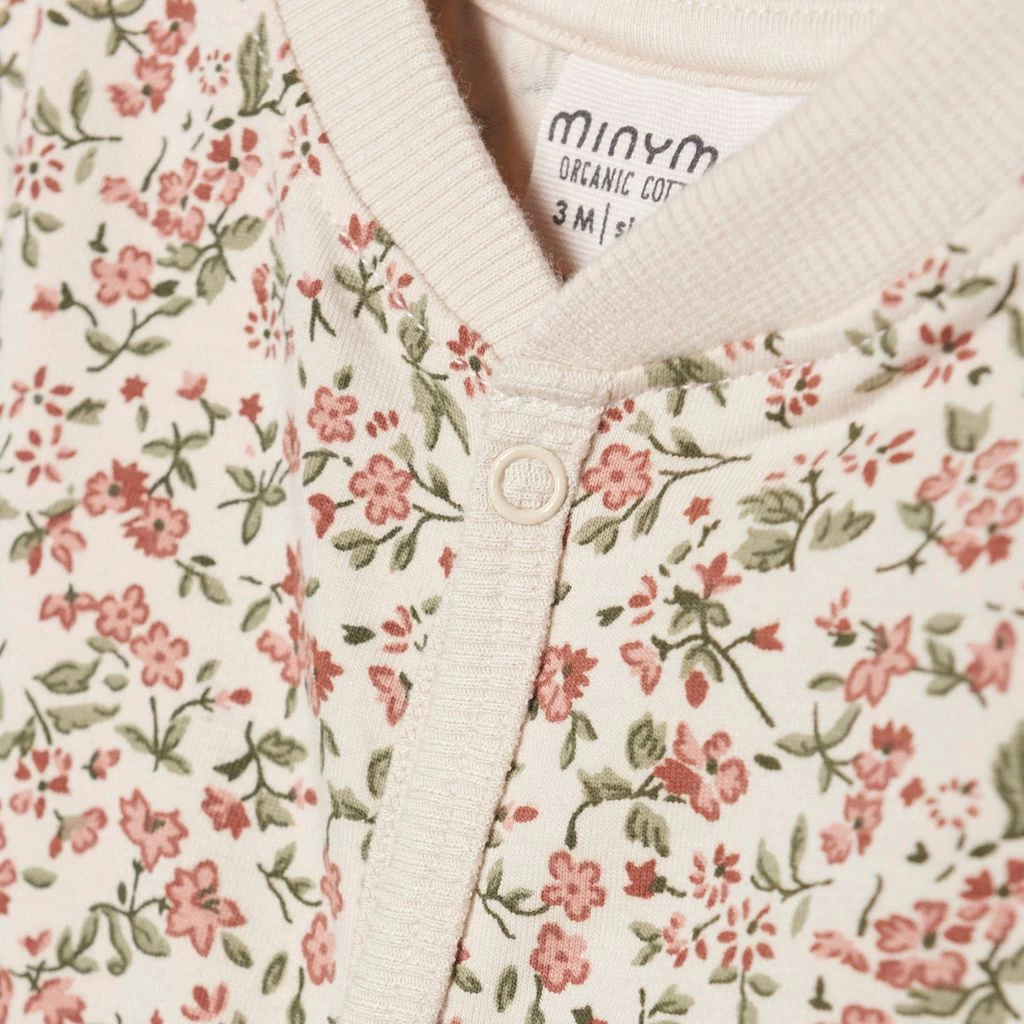 Follow the sandman to the land of dreams!. Beige one-piece by Minymo. The one-piece has a floral all-over print. It has snap buttons at the front and down the leg and ribbed cuffs.