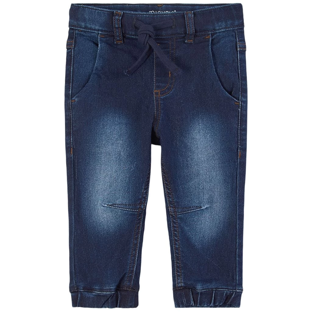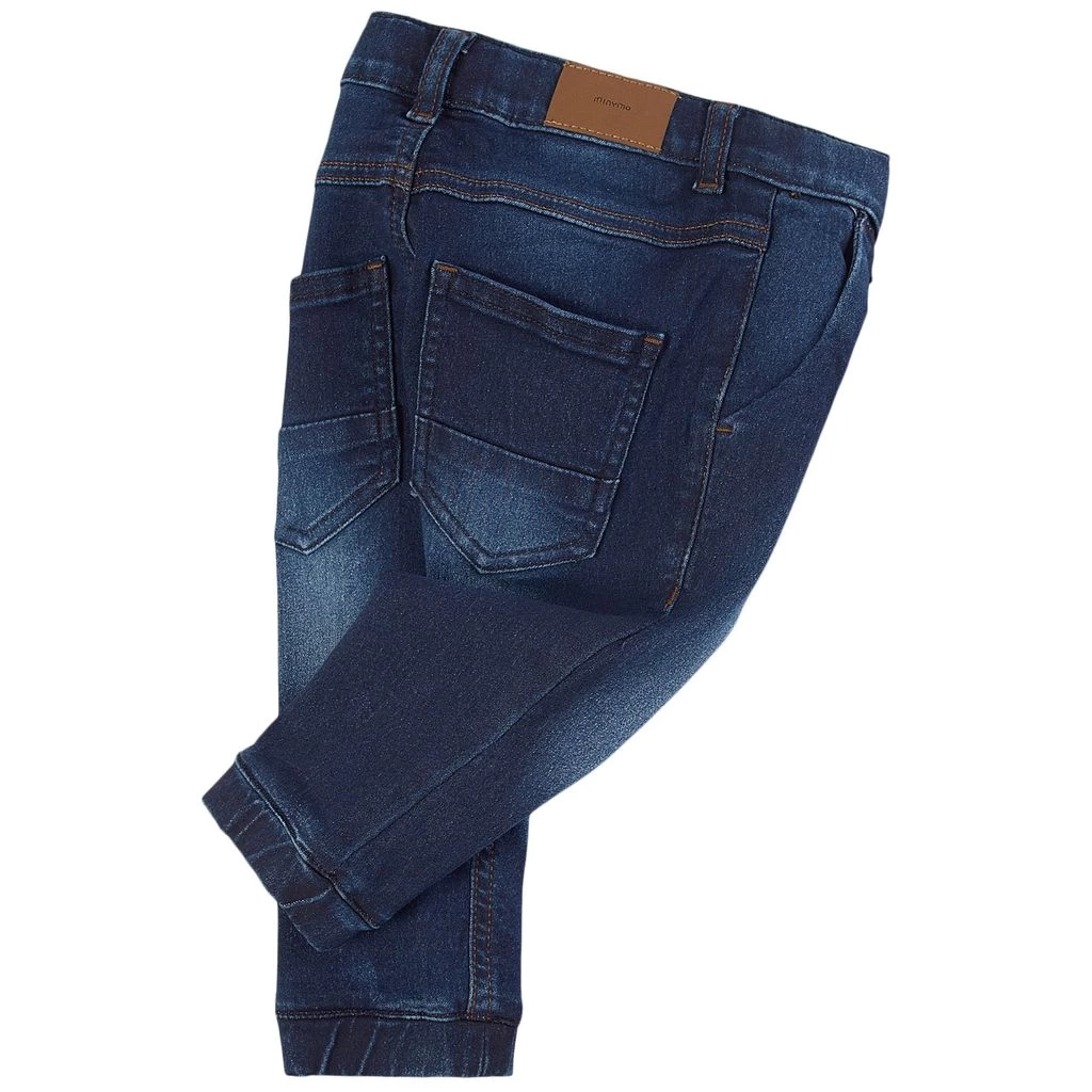 Dark navy Power Stretch jeans by Minymo. The jeans have a loose fit. They have an elasticated drawstring waist with a faux fly, pockets at the front and at the back and elasticated cuffs.