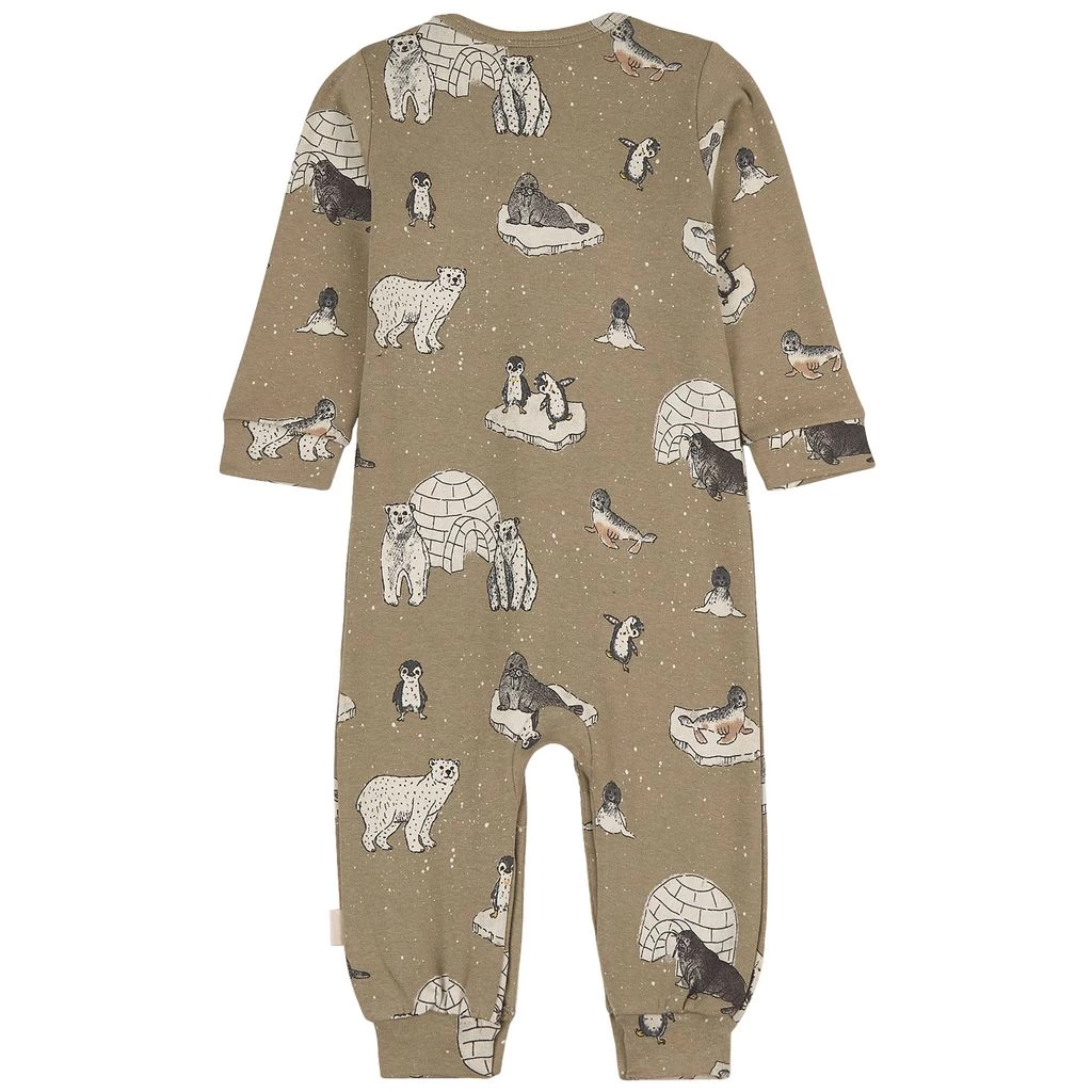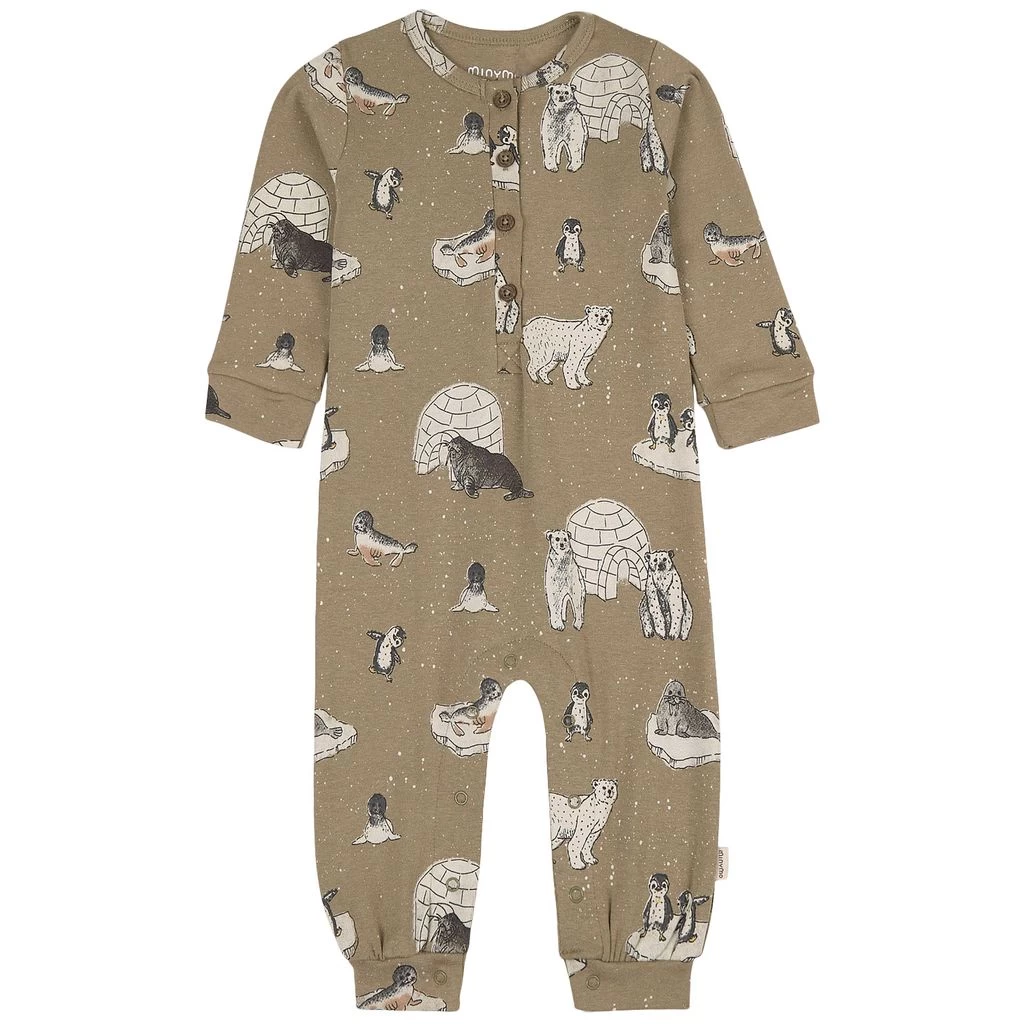 Let your baby explore and play in comfort. Green one-piece by Minymo. The one-piece has a button closure at the front. It has snap buttons between the legs and ribbed cuffs.