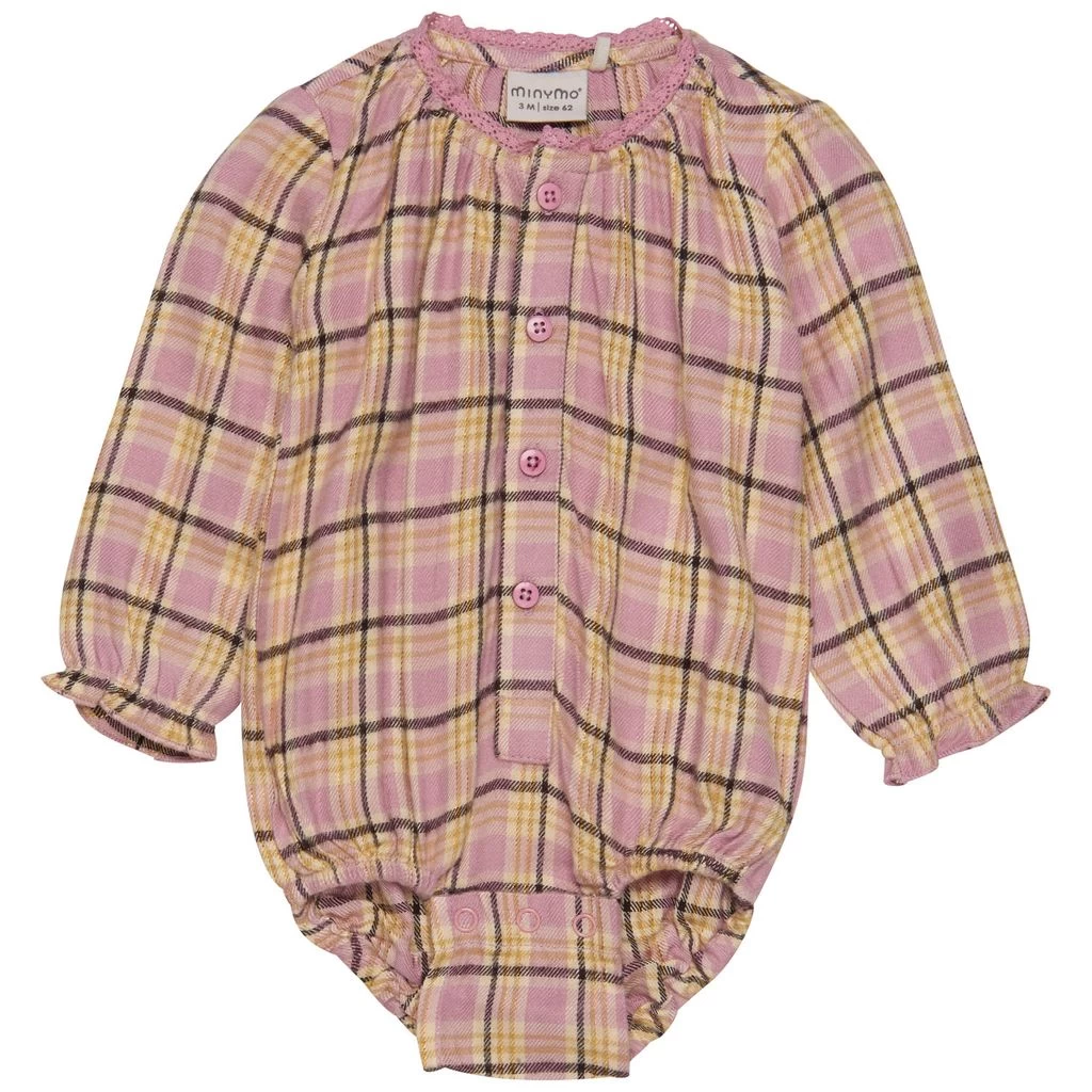 A perfect and fashionable look. Pink romper by Minymo. The romper has a checked pattern. It has a button placket at the front, a snap button closure between the legs, an embroidered detail on the neckline and elasticated cuffs.