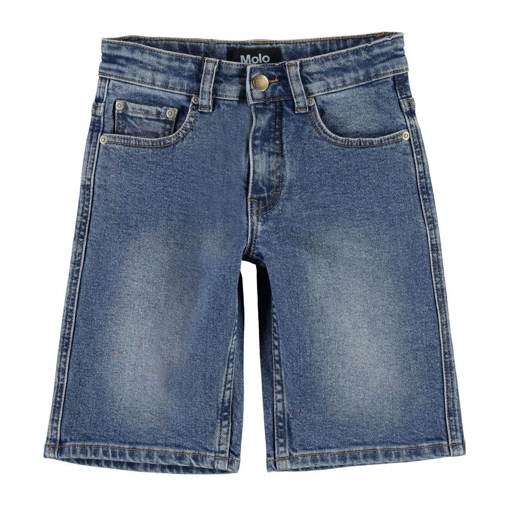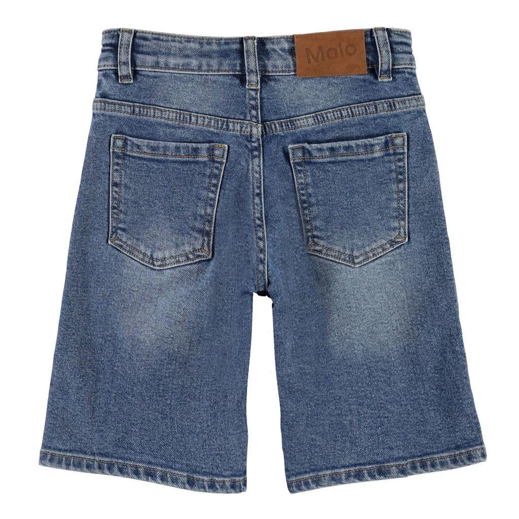Adrik denim shorts by Molo. The shorts have an adjustable button-elastic waist. They have a 5-pocket design and a zip fly with a button closure.