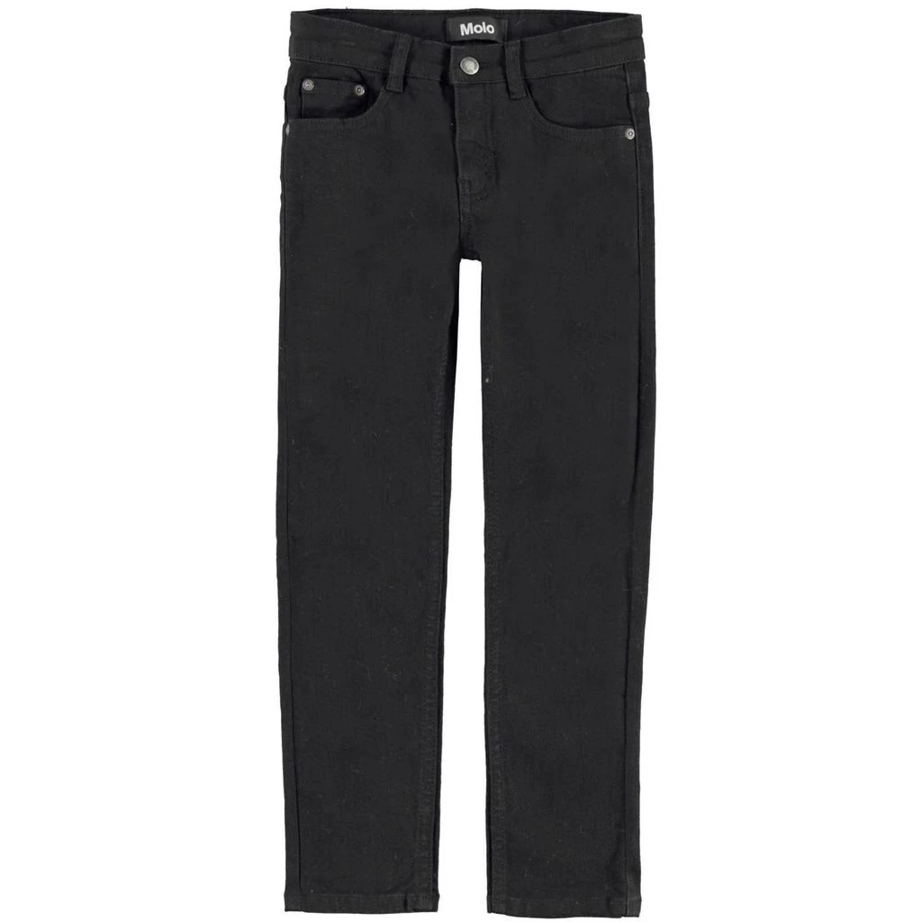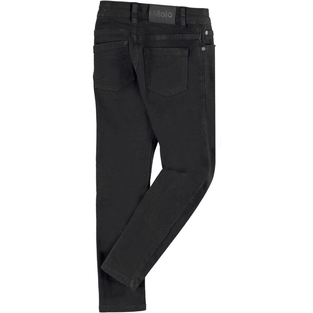 Black Aksel jeans by Molo. The jeans have a 5-pocket design. They have a slim fit, an adjustable button-elastic waist and a zip fly with a button closure.