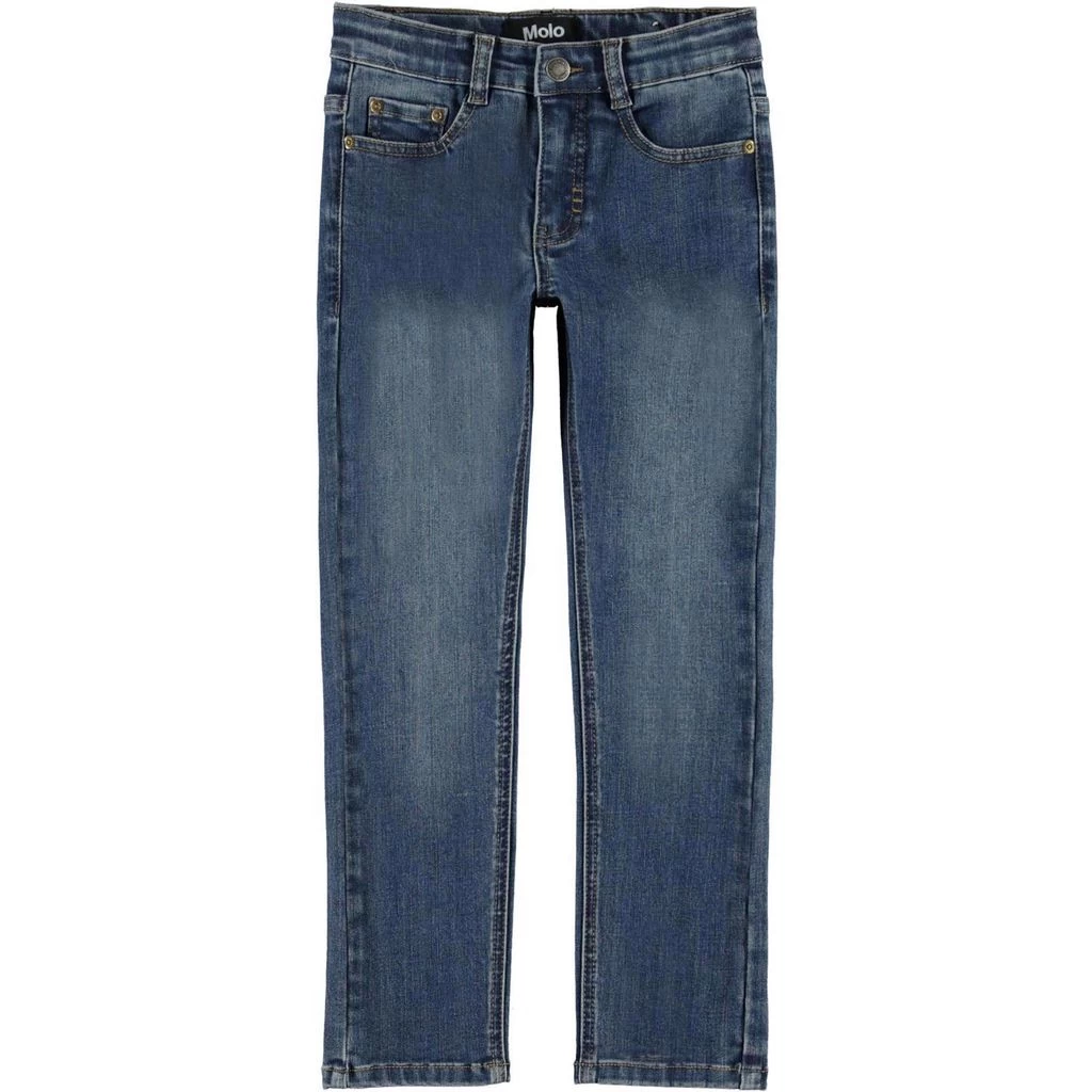 Blue Aksel jeans by Molo. The jeans have a 5-pocket design. They have a slim fit, an adjustable button-elastic waist and a zip fly with a button closure.