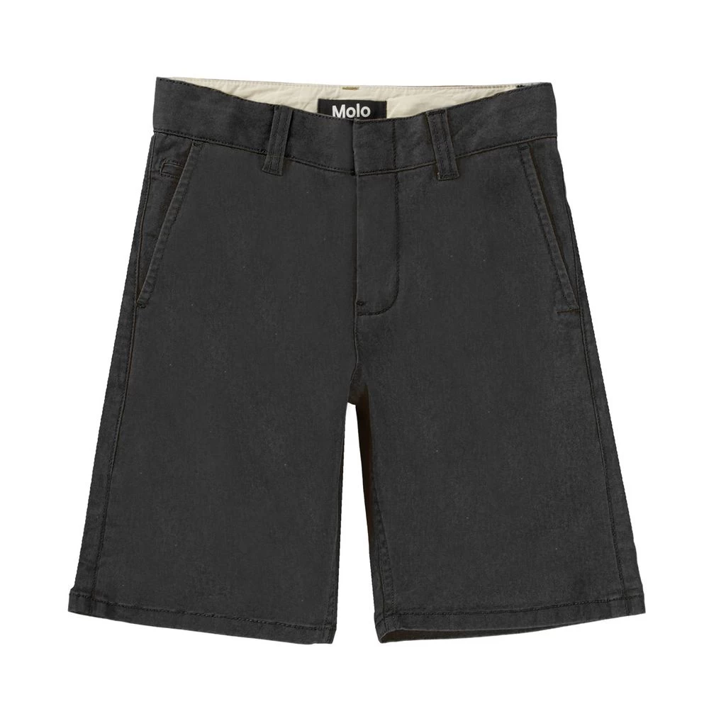 Black Alan shorts by Molo. The shorts have two front pockets. They have an adjustable button-elastic waist and folded cuffs.