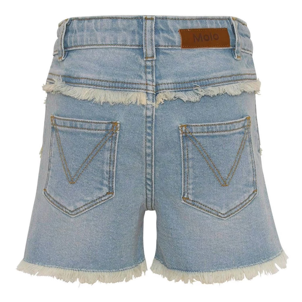 Alvira shorts by Molo. The shorts have an adjustable button-elastic waist. They have a zip fly with a button closure, two front pockets and a distressed details.