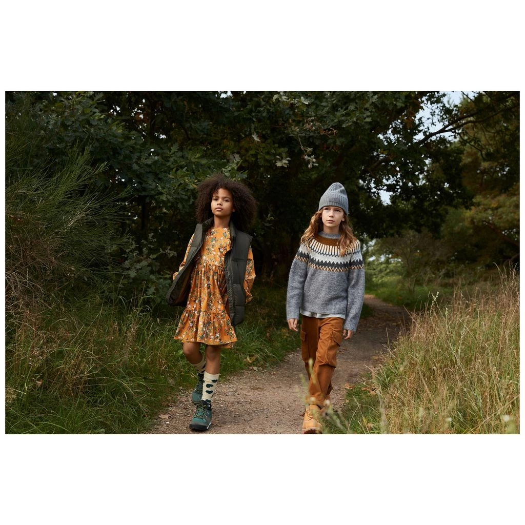Argo cargo pants by Molo. The pants have leg pockets with a snap button closure. They have a faux fly and an elasticated drawstring waist.