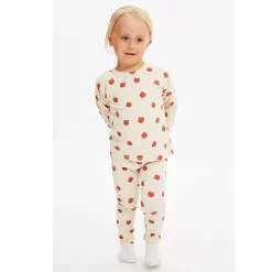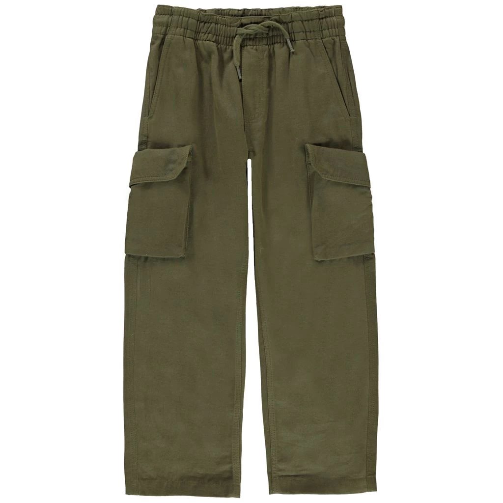 Argo cargo pants by Molo. The pants have leg pockets with a snap button closure. They have a faux fly and an elasticated drawstring waist.