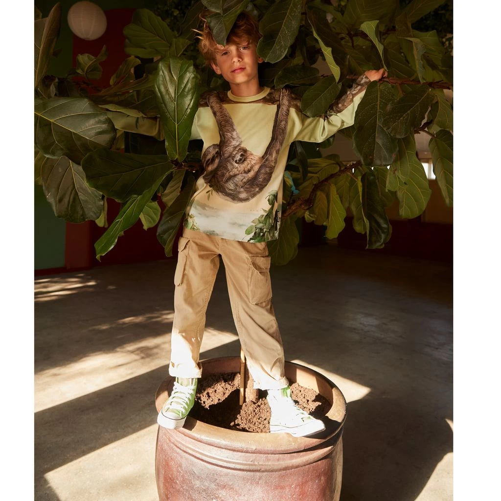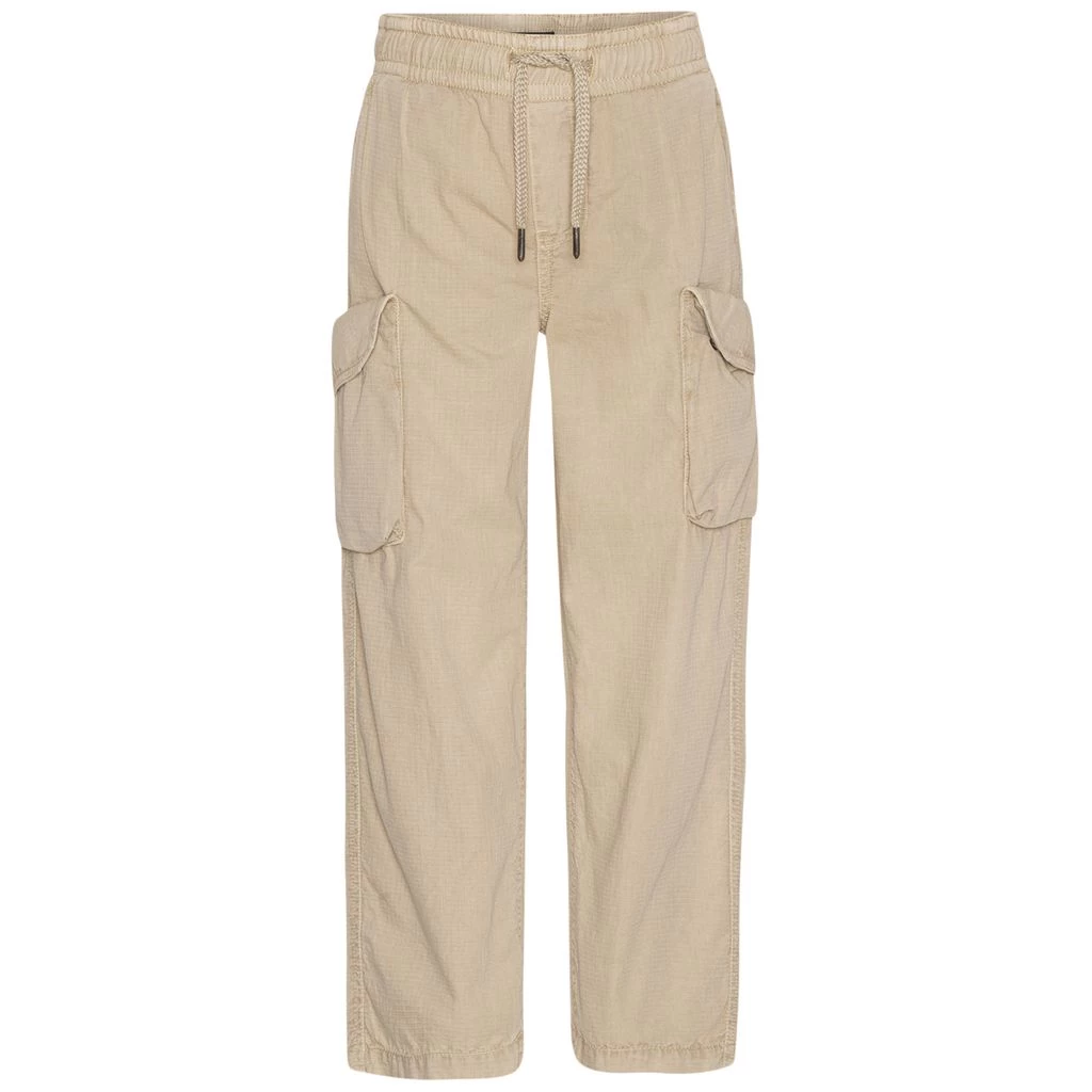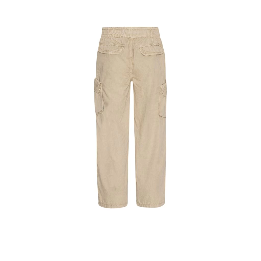 Let your little adventurer play in comfort. Beige Argo trousers by Molo. The trousers have an elasticated drawstring waist. They have two elasticated waists, two back pockets and pockets on the legs.